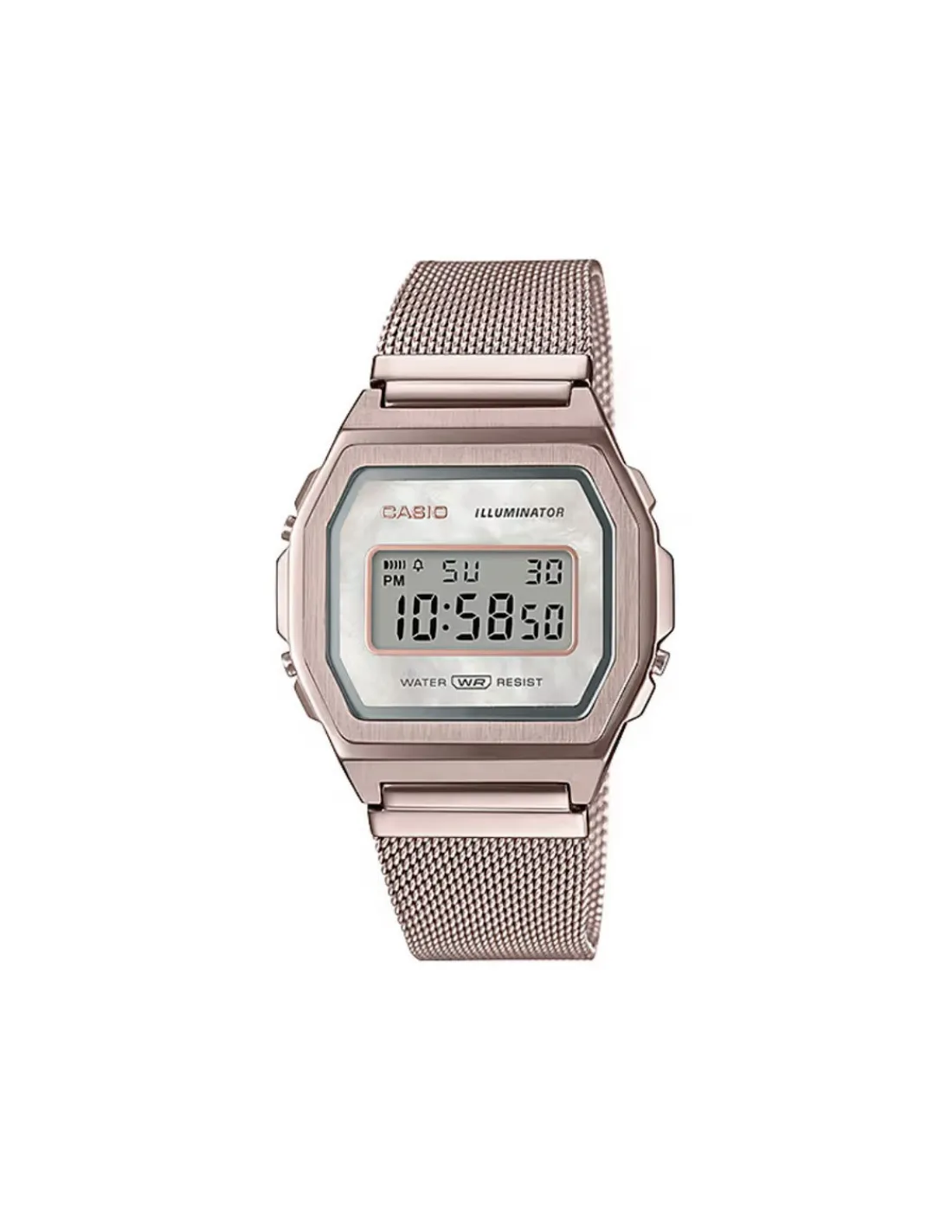 Reloj Casio Vintage Premium Collection A1000MPG-9EF para mujer con caja de acero en dorado melocotón con baño de iones, esfera digital y correa de malla milanesa en dorado melocotón con baño de iones. Movimiento de cuarzo.