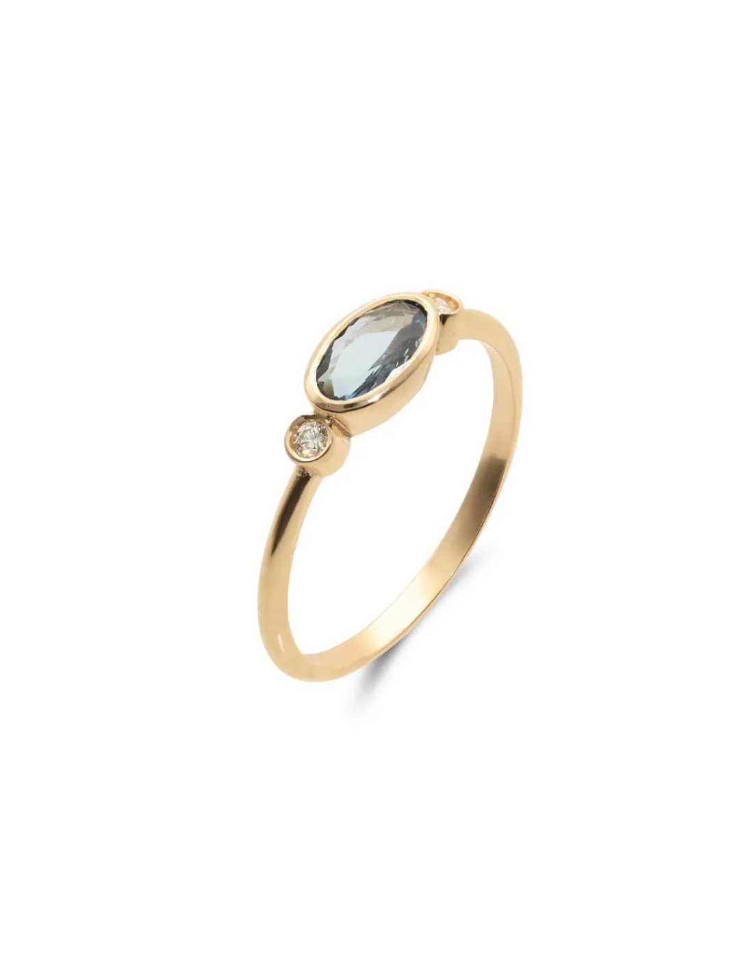 Anillo de oro amarillo 9 kt (375 mmas) con aguamarina talla oval engastada en boquilla acompañada de un diamante cada brillante a cada lado. Talla 14.