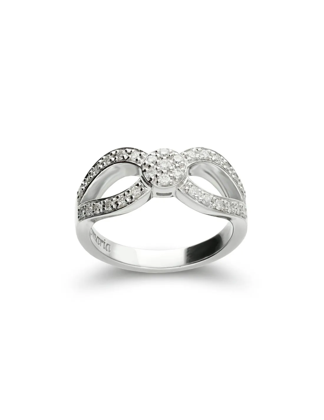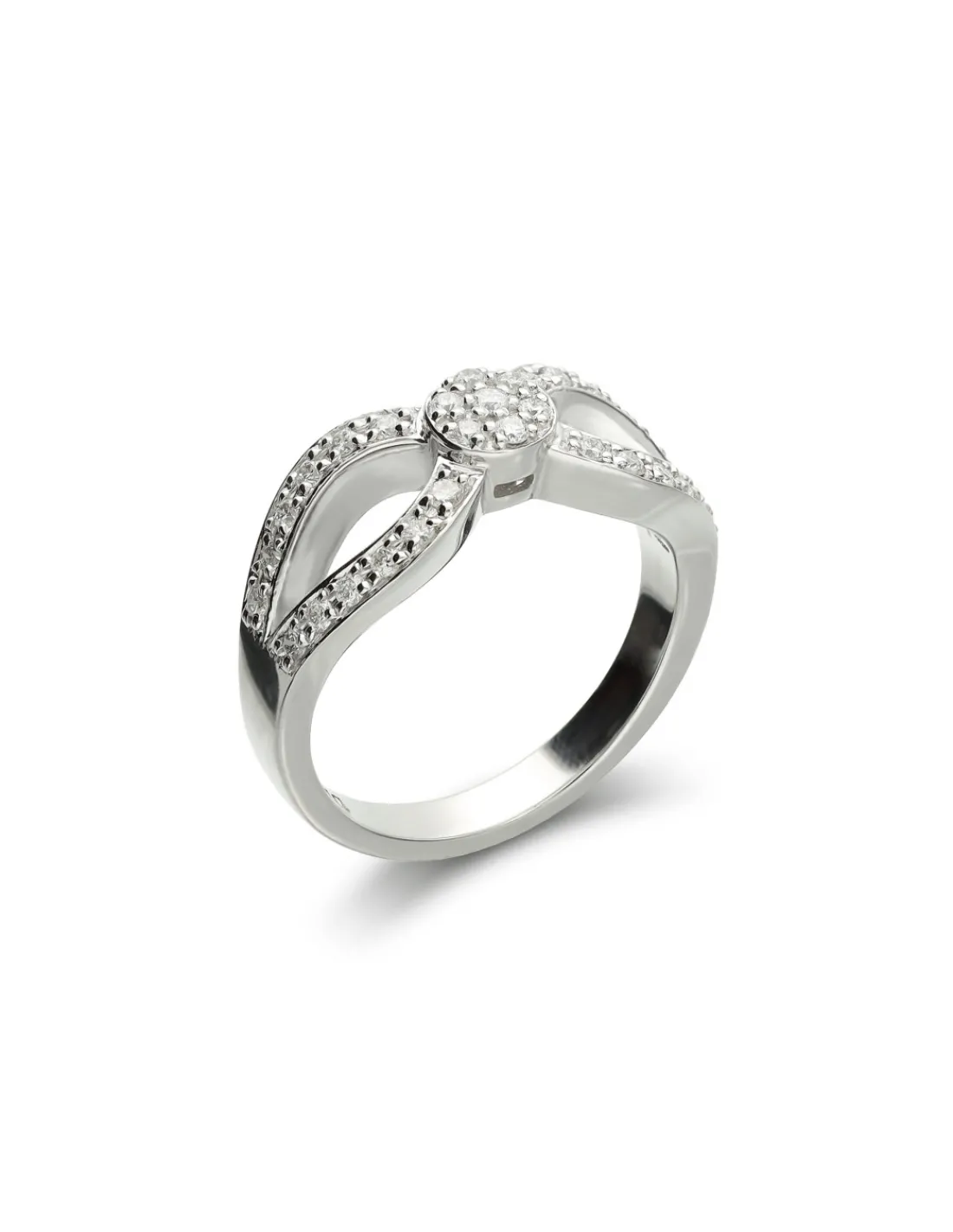 Anillo de oro blanco 1ª Ley (750 mmas) con un cuerpo innovador y diamantes talla brillante engastados en grano. Una imponente y distinguida joya con relucientes diamantes perfecta para sorprender. Talla 15.