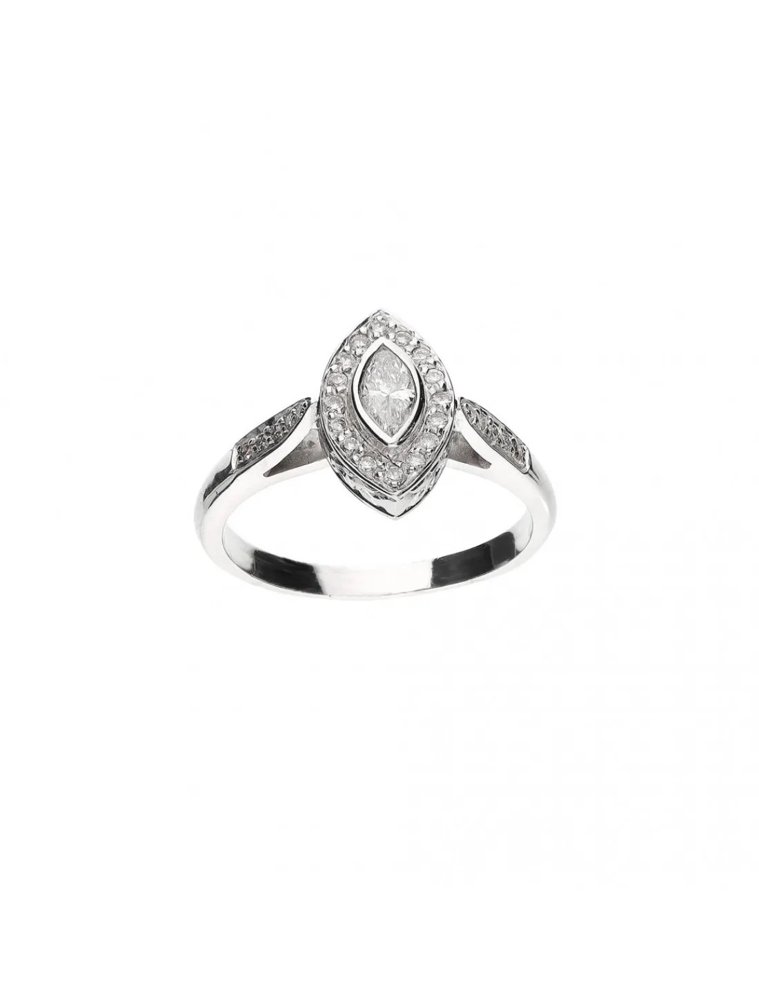 Anillo de oro blanco 1ª Ley (750 mmas) con un rombo en el centro engastado con diamante talla marquise rodeado de diamantes talla brillante y también en los laterales del aro. Talla 13.