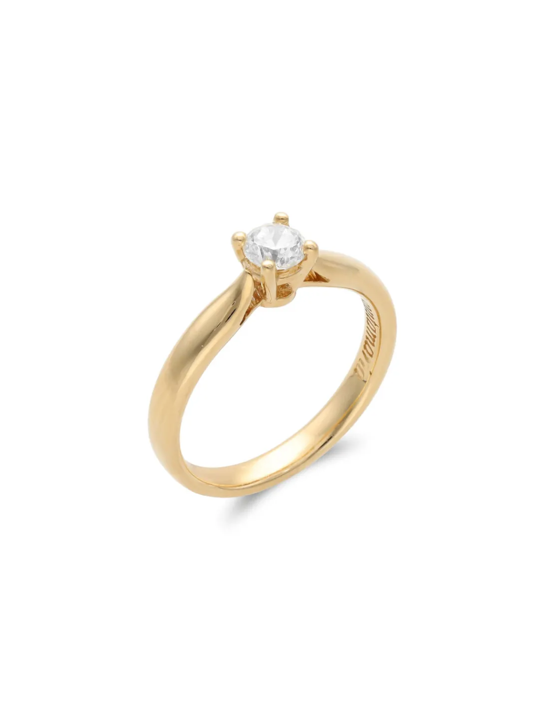 Anillo-Solitario de oro amarillo 1ª Ley (750 mmas) con diamante talla brillante. Un diamante exquisito y fino engarzado en cuatro garras es el detalle que aporta a esta joya su toque característico de exclusividad y elegancia.