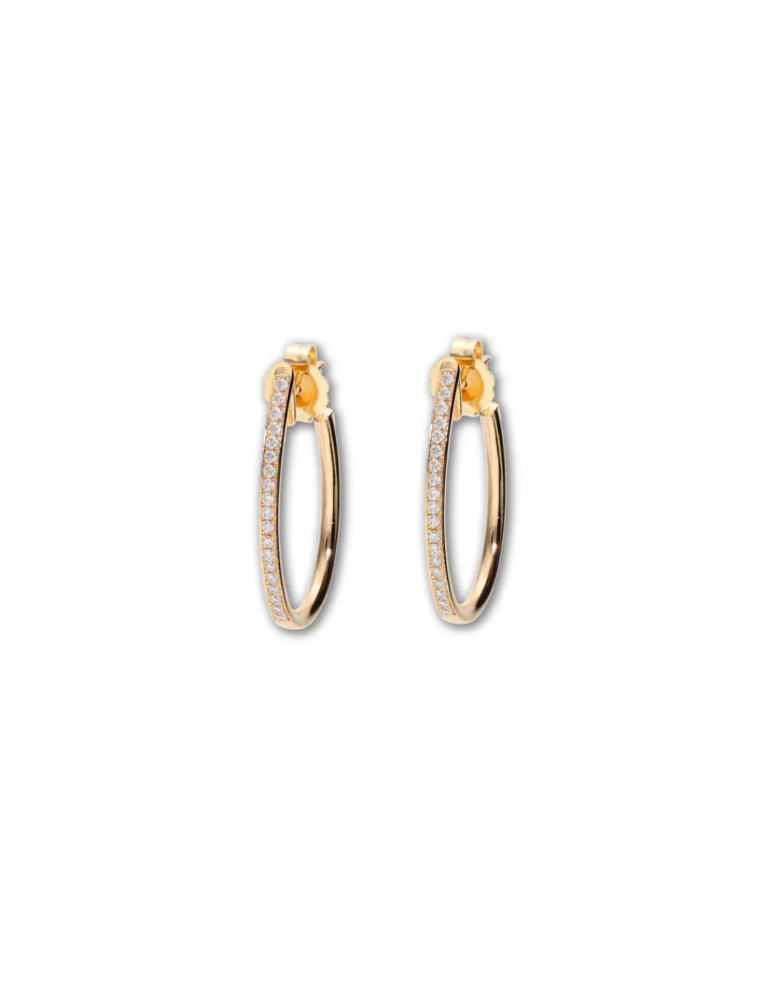 Argollas de oro amarillo 1ª Ley (750 mmas) con diamantes talla brillante engastados en grano. Una joya versátil y muy favorecedora para usar a diario y en ocasiones más especiales. Cierre de palillo y presión. Largo 3,1 cm.