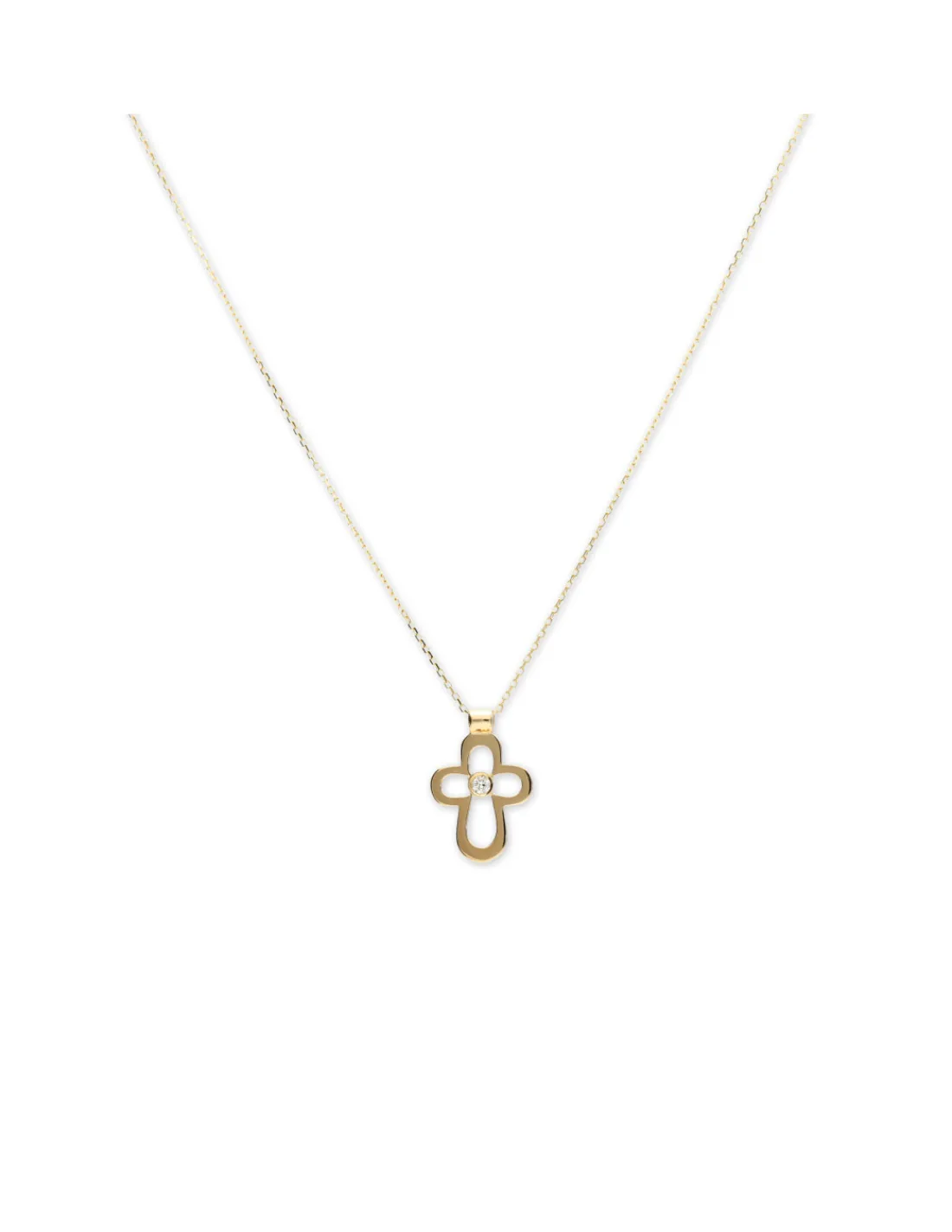 Cadena de oro amarillo 1ª Ley (750 mmas) acompañada de una cruz como detalle central con diamante talla brillante engastado en boquilla. Longitud cadena 43 cm ajustable a dos posiciones (43 cm y 39,5 cm). Alto aproximado del colgante incluyendo reasa 1,8 cm.