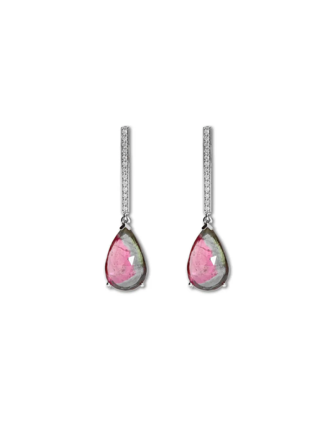 Pendientes de oro blanco 1ª Ley (750 mmas) con barra rígida de diamantes talla brillante engastados en grano de la que cuelga una turmalina natural en tonos verdes y rosados con forma de pera. Largo aproximado 4,3 cm. Cierre de palillo y presión.