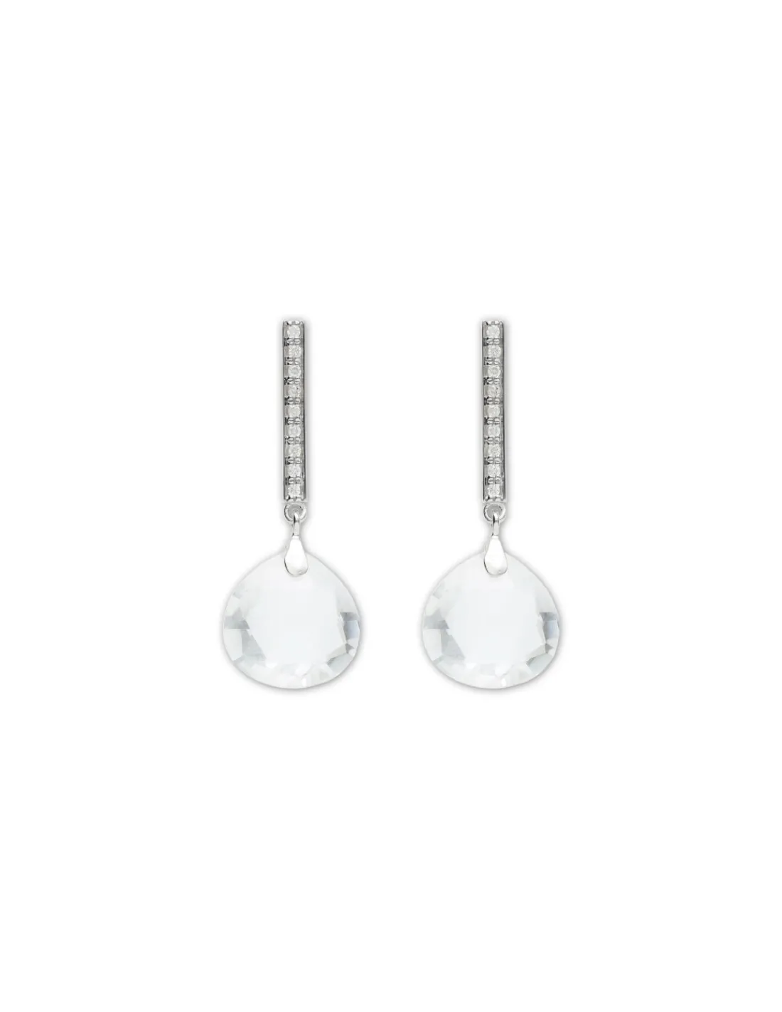 Pendientes de oro blanco 9 kt (375 mmas) con barra rígida y diamantes engastados de la que cuelga un cristal de roca talla pera briolette.