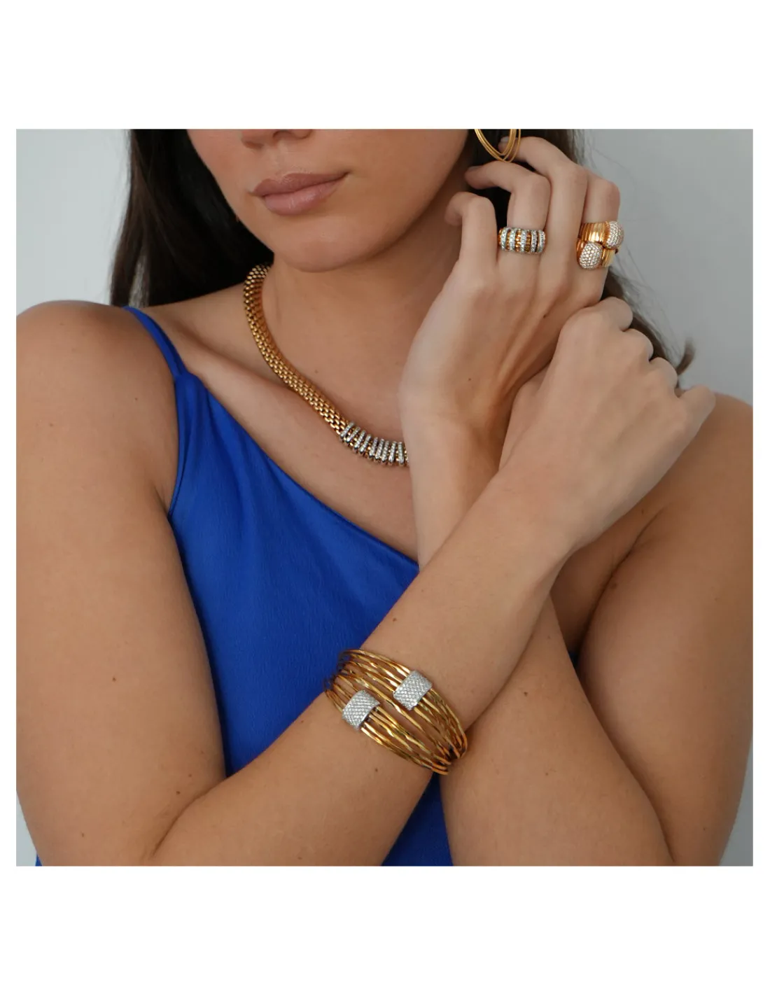 Pulsera rígida de oro amarillo-blanco 1ª Ley (750 mmas) con pavé de diamantes y líneas entrecruzadas. Una espectacular joya con carácter llamativo y un brillo único.