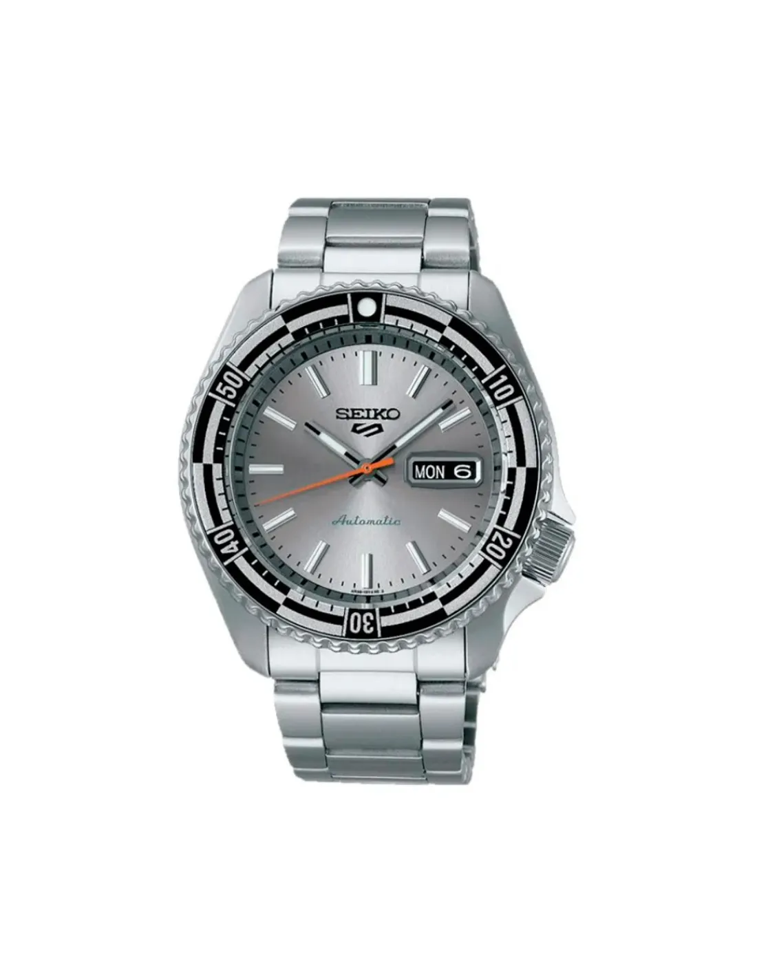 Reloj Seiko 5 Sports SKX Style Edición Especial para hombre con caja de de acero de 42,5 mm de diámetro, bisel giratorio unidireccional, esfera color plata con Lumibrite en agujas, índices y bisel, cristal de Hardlex curvado y brazalete de acero. Calibre 4R36. Movimiento automático con 41 horas de reserva de marcha aproximadamente.