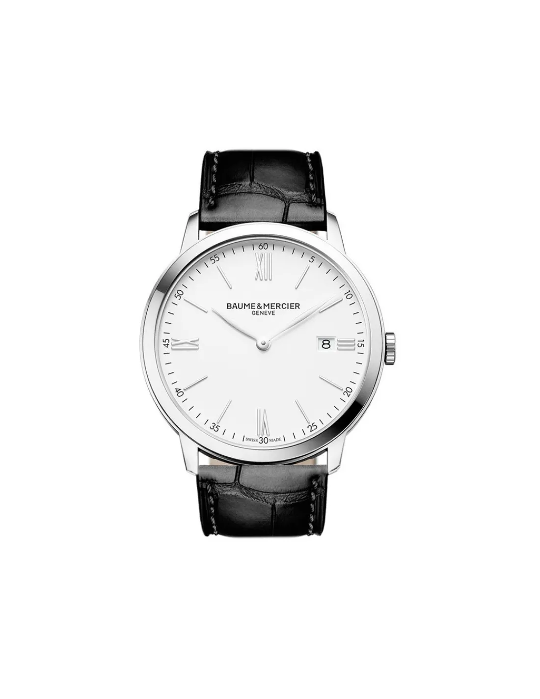 Reloj Baume et Mercier Classima con caja de acero de 39 mm, lujosa esfera blanca con agujas y números romanos plateados acompañada de correa de piel de cocodrilo negra. Un reloj estilo clásico y atemporal. Movimiento de cuarzo Swiss Made.