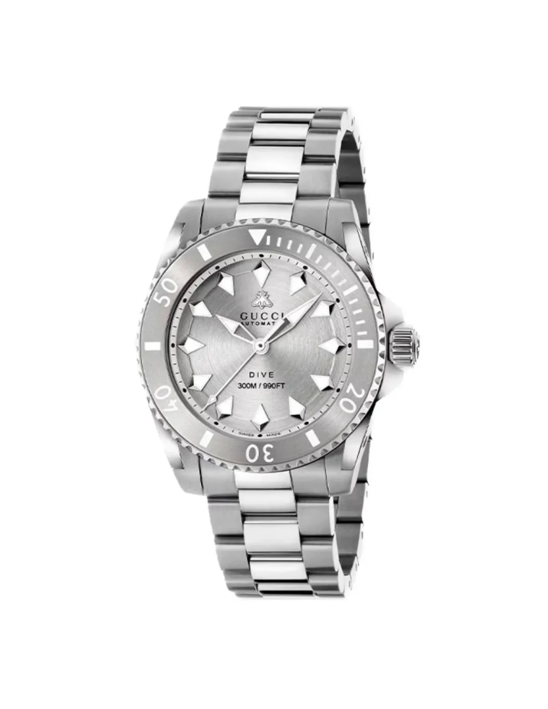 Reloj Gucci para hombre con caja de acero de 40 mm, bisel de acero, cristal de zafiro con revestimiento antirreflectante, esfera color plata combinado con brazalete de acero. El Gucci Dive se caracteriza por su diseño inspirado en los relojes de buceo. La última colección se inspira en los modelos tradicionales para reimaginar los códigos emblemáticos con un espíritu contemporáneo. Movimiento automático Swiss Made y 38 horas de reserva de marcha.