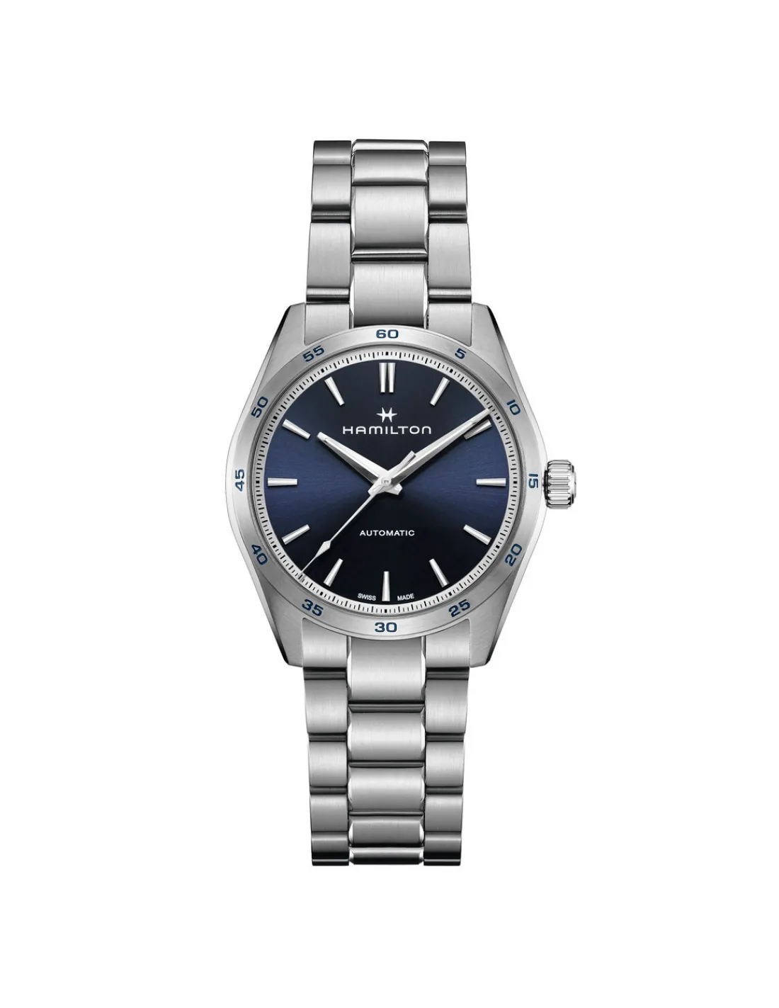Reloj Hamilton Jazzmaster Performer Auto para hombre con caja de acero inoxidable de 38 mm de diámetro, esfera azul con índices y agujas plateadas con Superluminova y cristal de zafiro resistente a los arañazos combinado con brazalete de acero. Calibre H-10. Movimiento automático Swiss Made con 80 horas de reserva de marcha. Un reloj para quienes combinan la funcionalidad con un estilo deportivo y refinado.