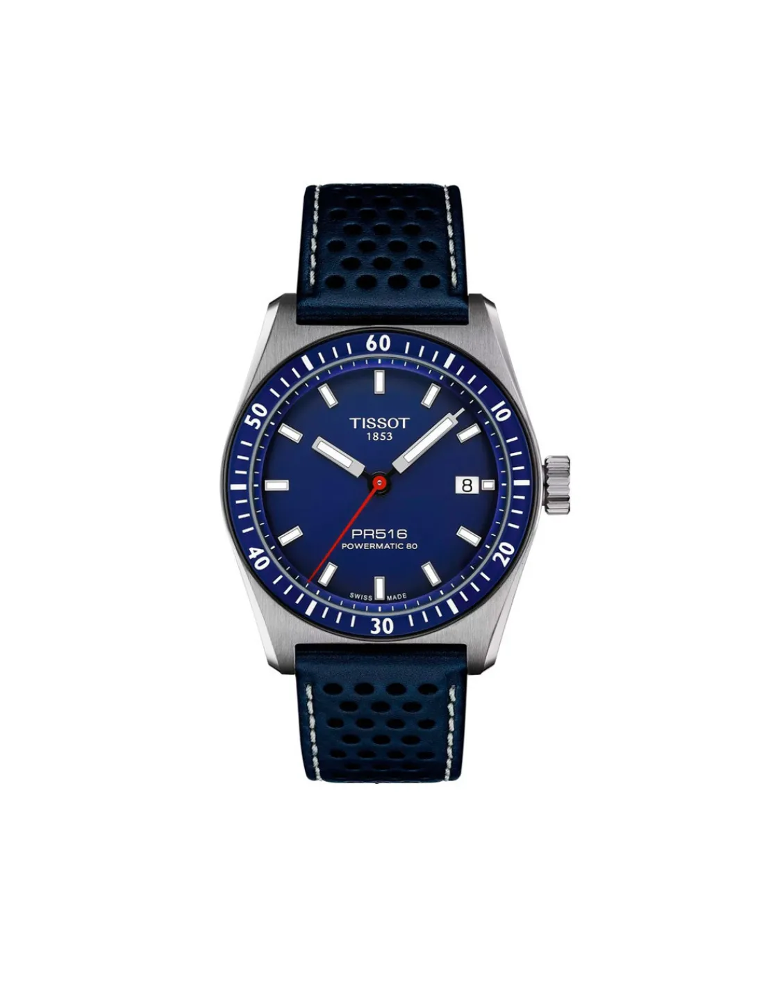 Reloj Tissot PR516 Powermatic 80 con caja de acero inoxidable de 38 mm de diámetro, cristal de zafiro resistente a los arañazos con tratamiento antirreflejos, esfera azul con agujas e índices luminiscentes combinado con correa de piel azul. El PR516 Powermatic es un clásico moderno que combina con la rica herencia de Tissot. Movimiento automático Swiss Made con 80 horas de reserva de marcha.