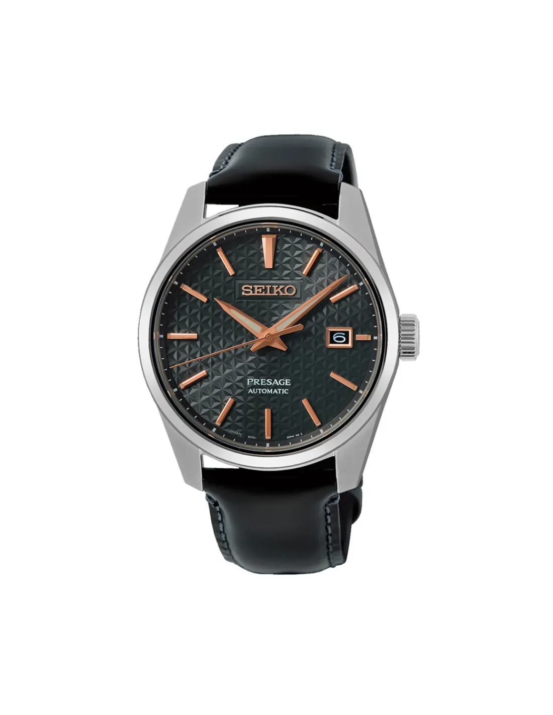 Reloj Seiko Presage Sharp Edged para hombre con caja de acero de 39,3 mm de diámetro que combina con una sobria esfera efecto gilloché en tonos negro grisáceo con índices y agujas en color oro rosa que cuentan con revestimiento de Lumibrite y correa de piel negra lisa. Movimiento automático calibre 6R35 con reserva de marcha de aproximadamente 70 horas.