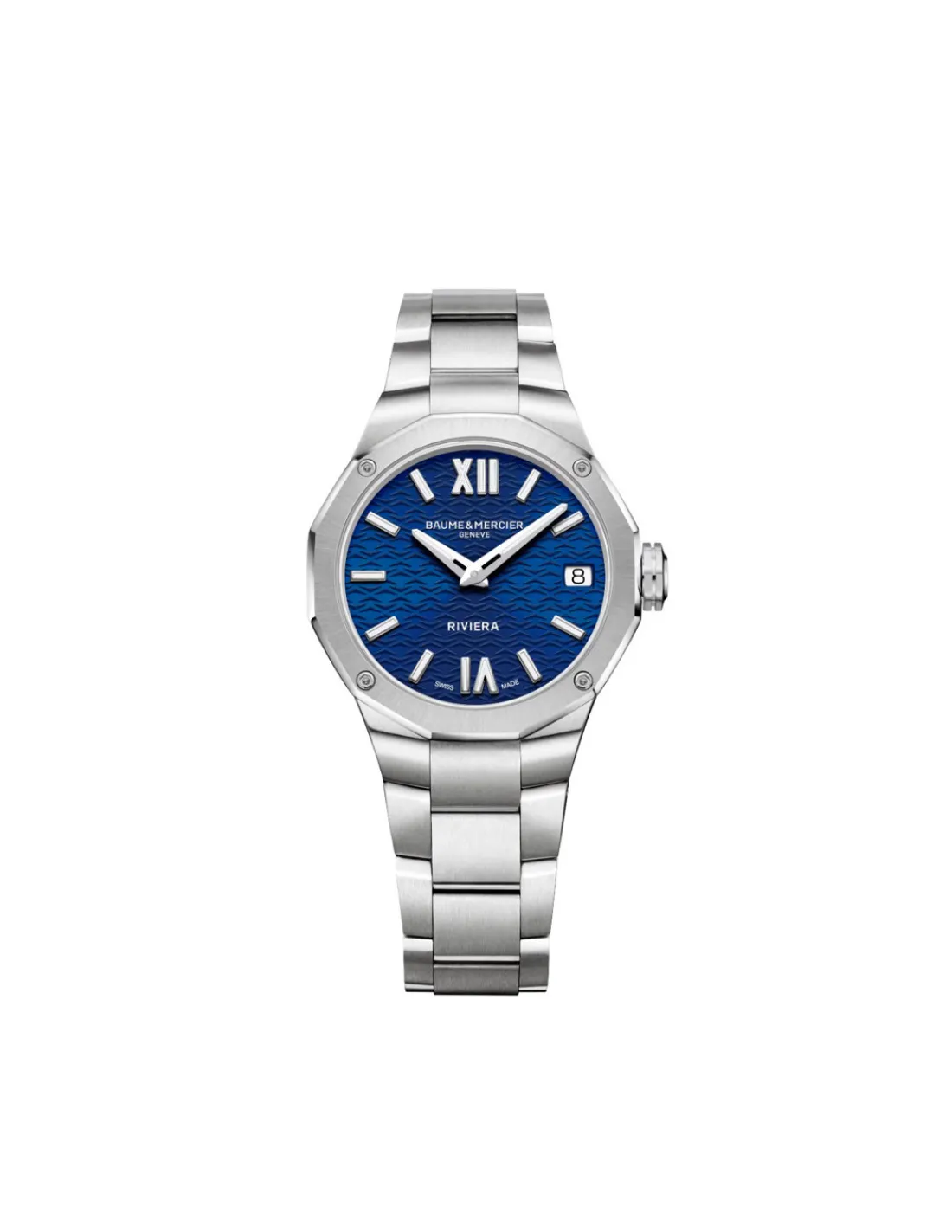 Reloj Baume et Mercier Riviera con caja de acero de 33 mm, esfera azul satinada soleil con decoración ondulada, números romanos e índices ribeteados con Superluminova y agujas facetadas rodiadas combinado con brazalete. Un reloj inspirado en el arte de vivir de la Riviera francesa, elegante y símbolo de libertad. Movimiento de cuarzo Swiss Made con 10 años de autonomía.