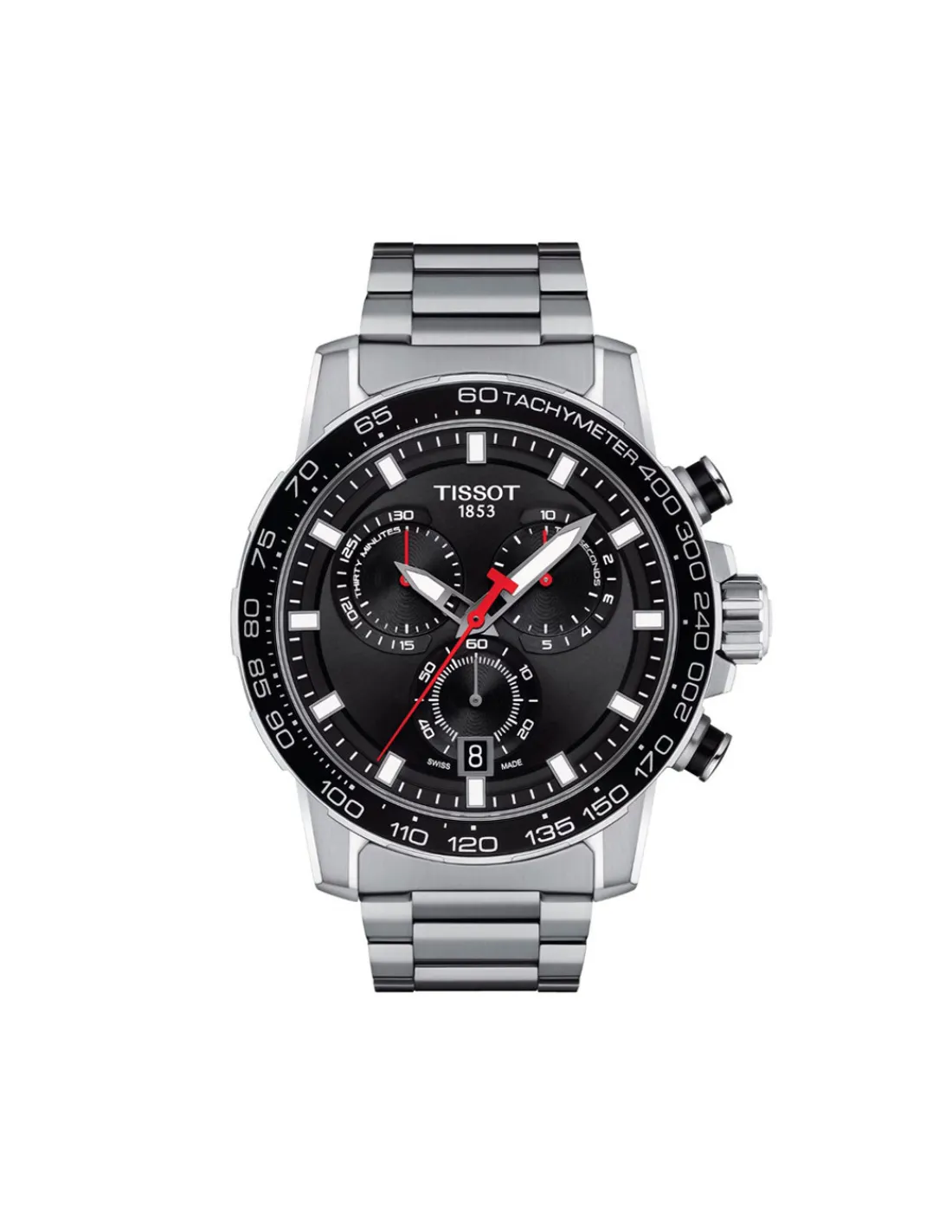 Reloj Tissot Supersport Chrono con caja de acero inoxidable de 45,5 mm de diámetro, esfera negra con bisel de aluminio, cristal de zafiro resistente a los arañazos y brazalete. Un cronógrafo suizo con personalidad deportiva y espíritu retro y movimiento de cuarzo Swiss Made.