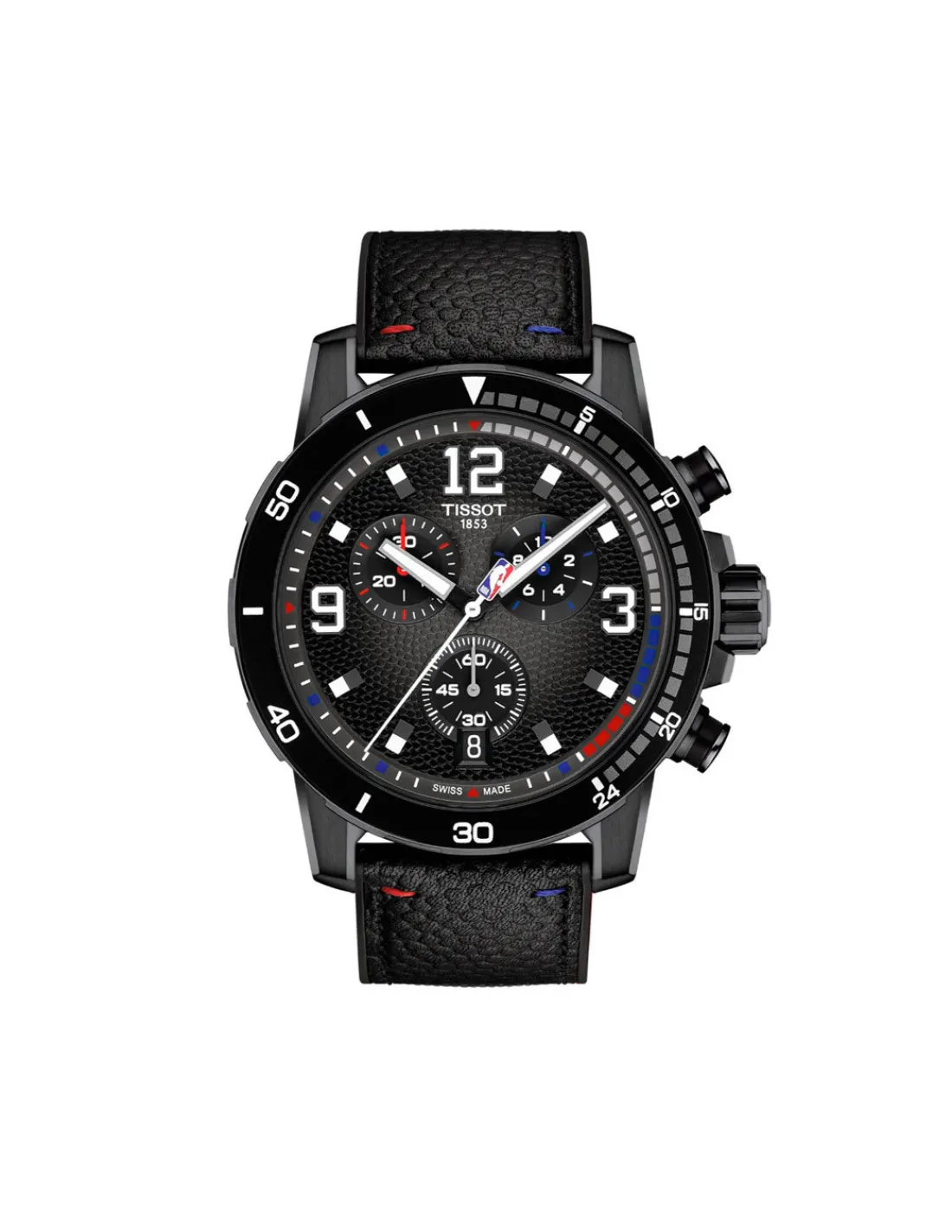 Reloj Tissot Supersport NBA Special Edition con caja de 45,5 mm de acero inoxidable con revestimiento de PVD negro, cristal de zafiro abombado resistente a los arañazos con tratamiento antirreflejos, esfera degradado antracita con números arábigos e índices SuperLuminova combinado con correa de cuero negro. Movimiento cronógrafo de cuarzo Swiss Made.