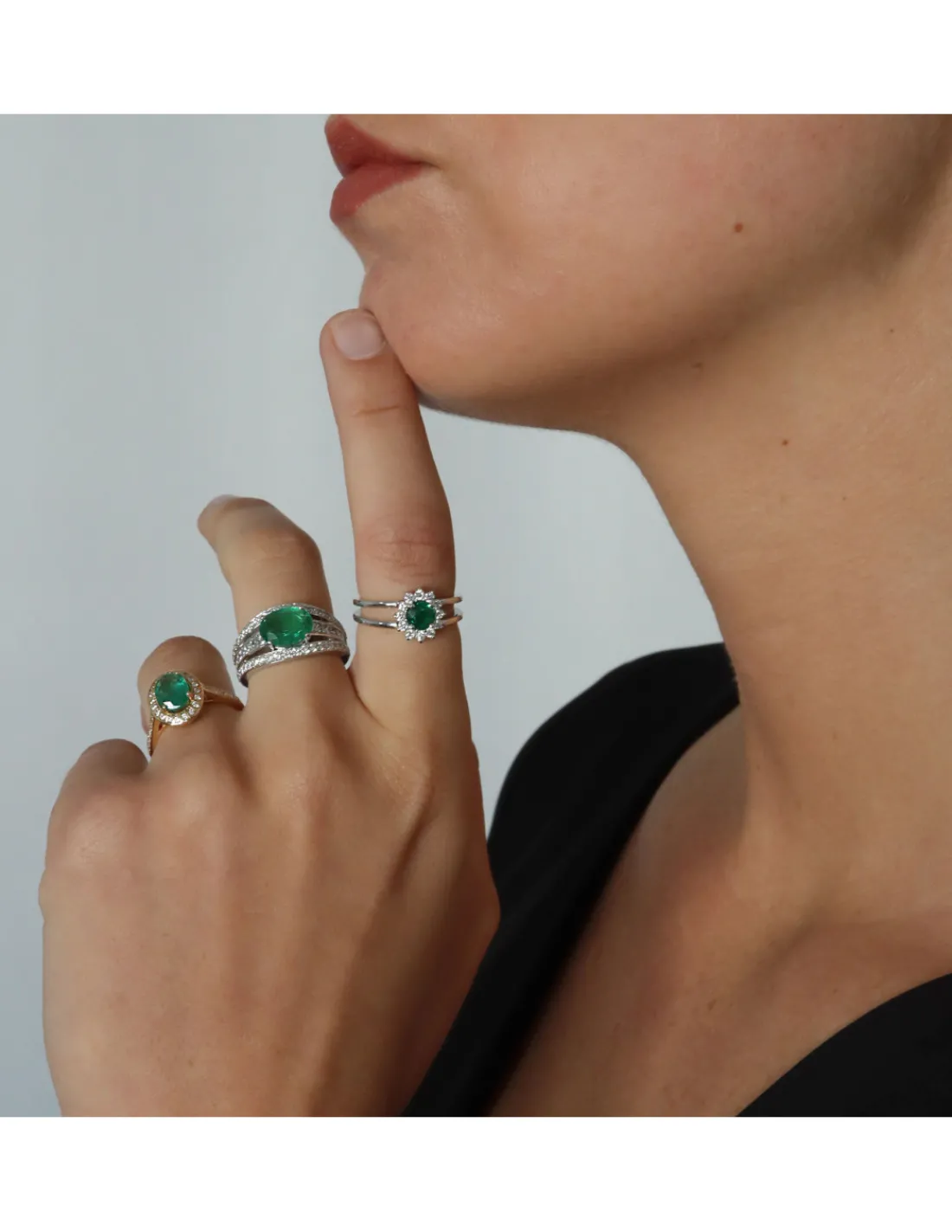 Anillo de oro blanco 1ª Ley (750 mmas) con doble aro combinado con esmeralda natural redonda rodeada de diamantes talla brillante. Una joya perfecta y atemporal para pedida de mano.