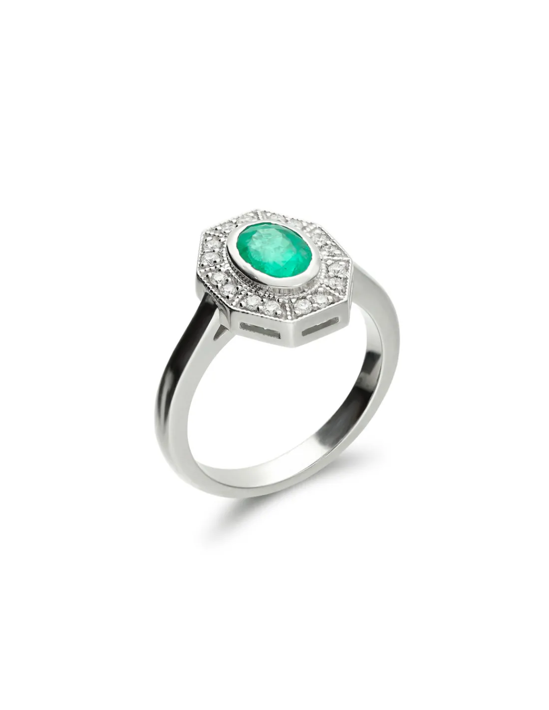 Anillo de oro blanco 1ª Ley (750 mmas) con esmeralda natural talla oval en el centro engastada en boquilla rodeada de diamantes talla brillante.
