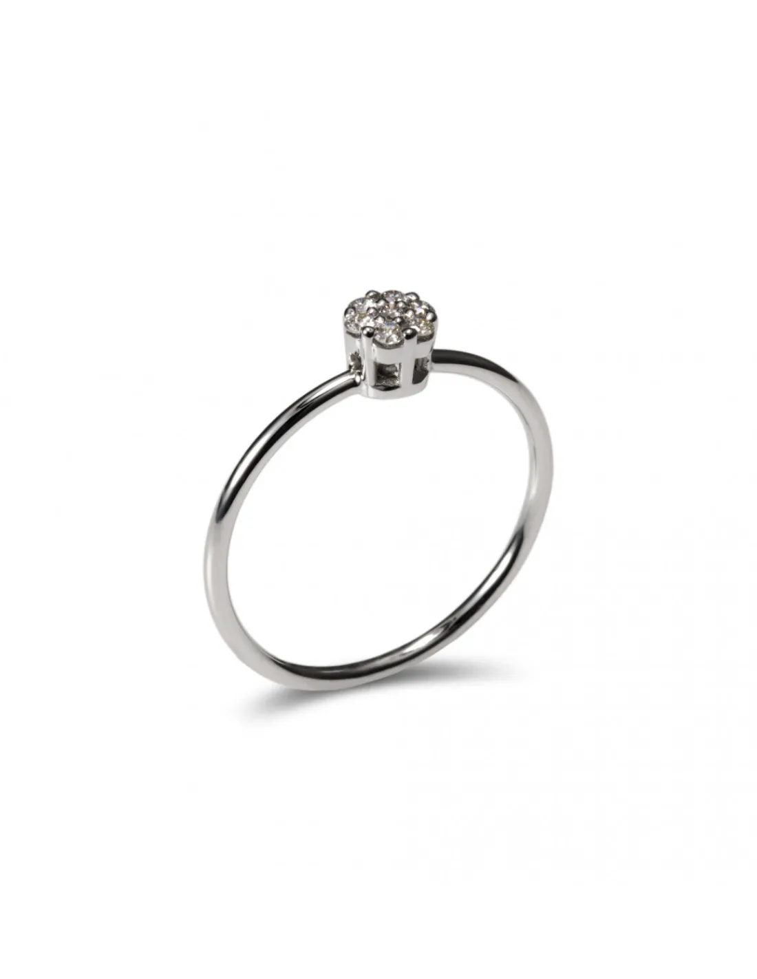 Anillo de oro blanco 1ª Ley (750 mmas) con roseta de diamantes talla brillante engastados en grano. Aro fino y redondo. Talla 14.
