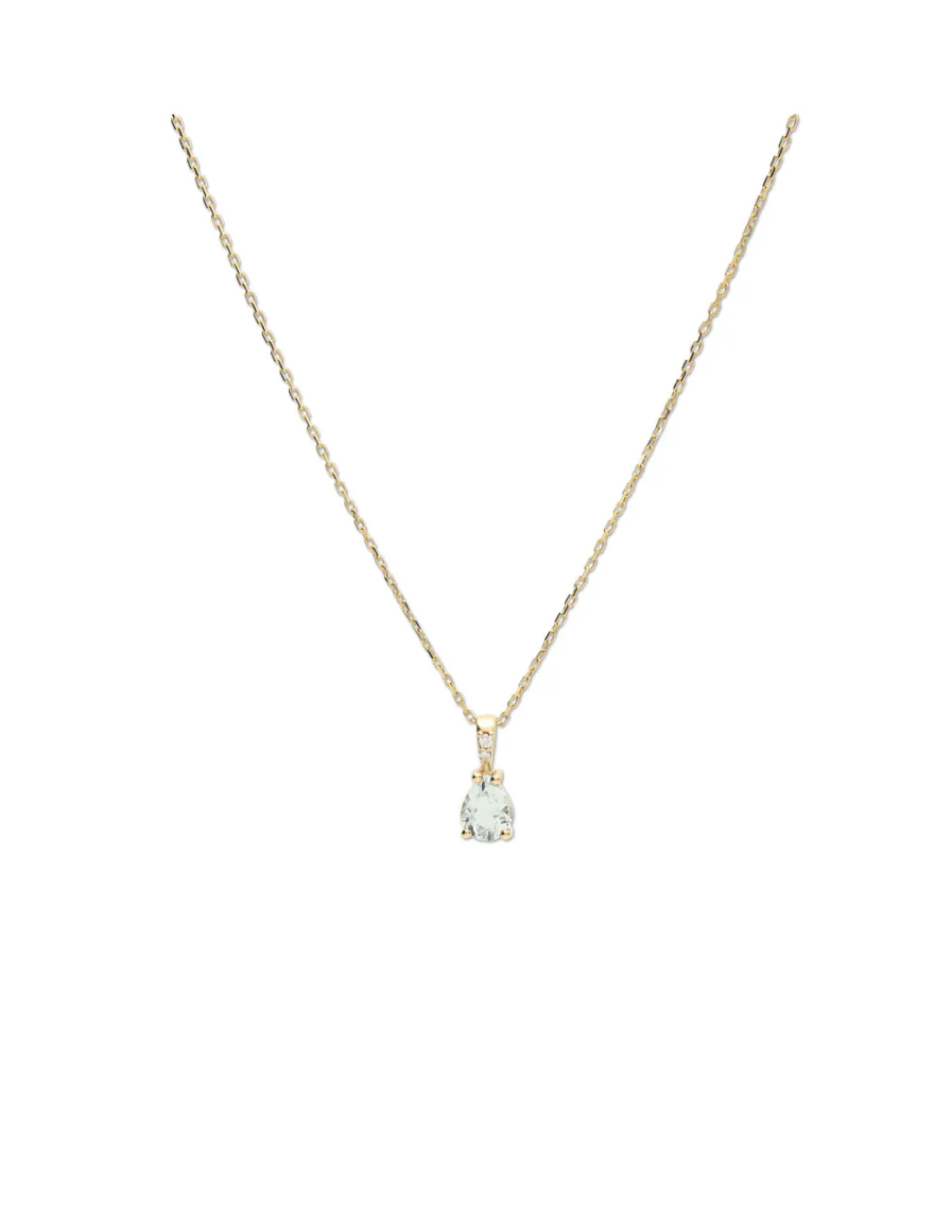 Cadena-Colgante de oro amarillo 9 kt (375 mmas) con dos diamantes talla brillante engastados en la reasa y aguamarina talla pera. Longitud cadena 45 cm. Tamaño del colgante incluyendo reasa 1 cm.