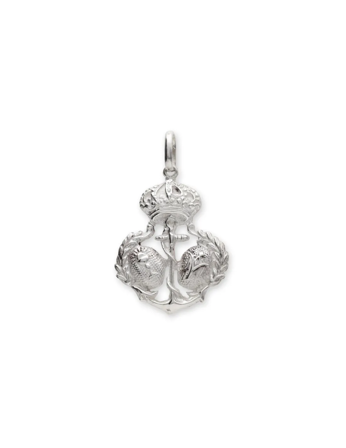 Colgante de plata 1ª Ley (925 mmas) escudo Hermandad de la Esperanza de Triana. Tamaño aproximado incluyendo asa y reasa 4,2 cm. Disponible en dos tamaños.