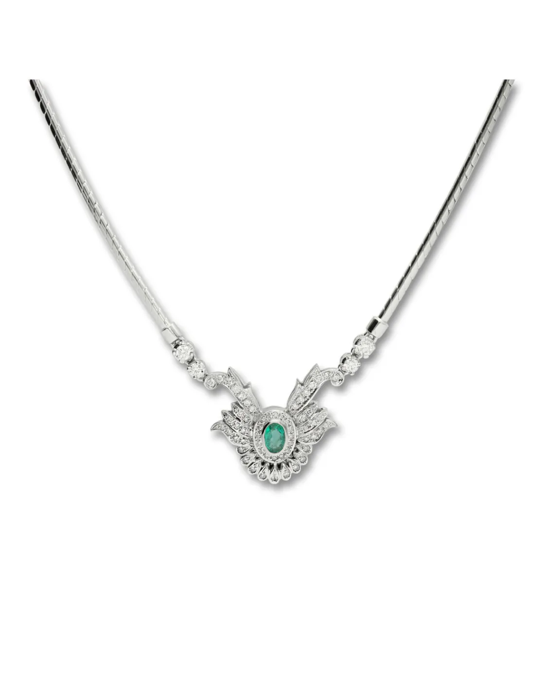 Gargantilla de oro blanco 1ª Ley (750 mmas) con esmeralda oval y diamantes talla brillante. Una pieza con diseño clásico, elegante y antiguo.
