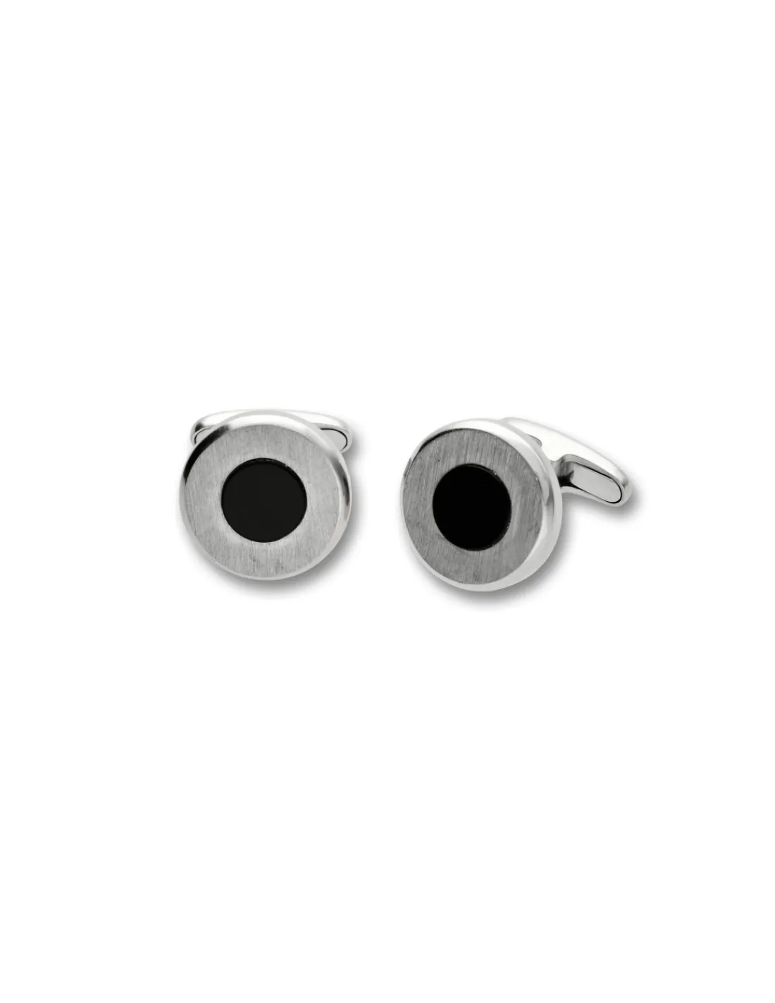 Gemelos de plata de 1ª Ley (925 mmas) redondos matizados con ónix en el centro. Sistema de cierre rígido. Diámetro 16 mm.
