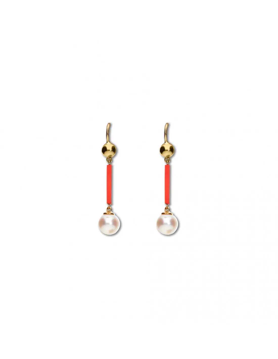 Pendiente de oro amarillo 1ª Ley (750 mmas) con ágata simulando una barra de la que cuelga una perla.