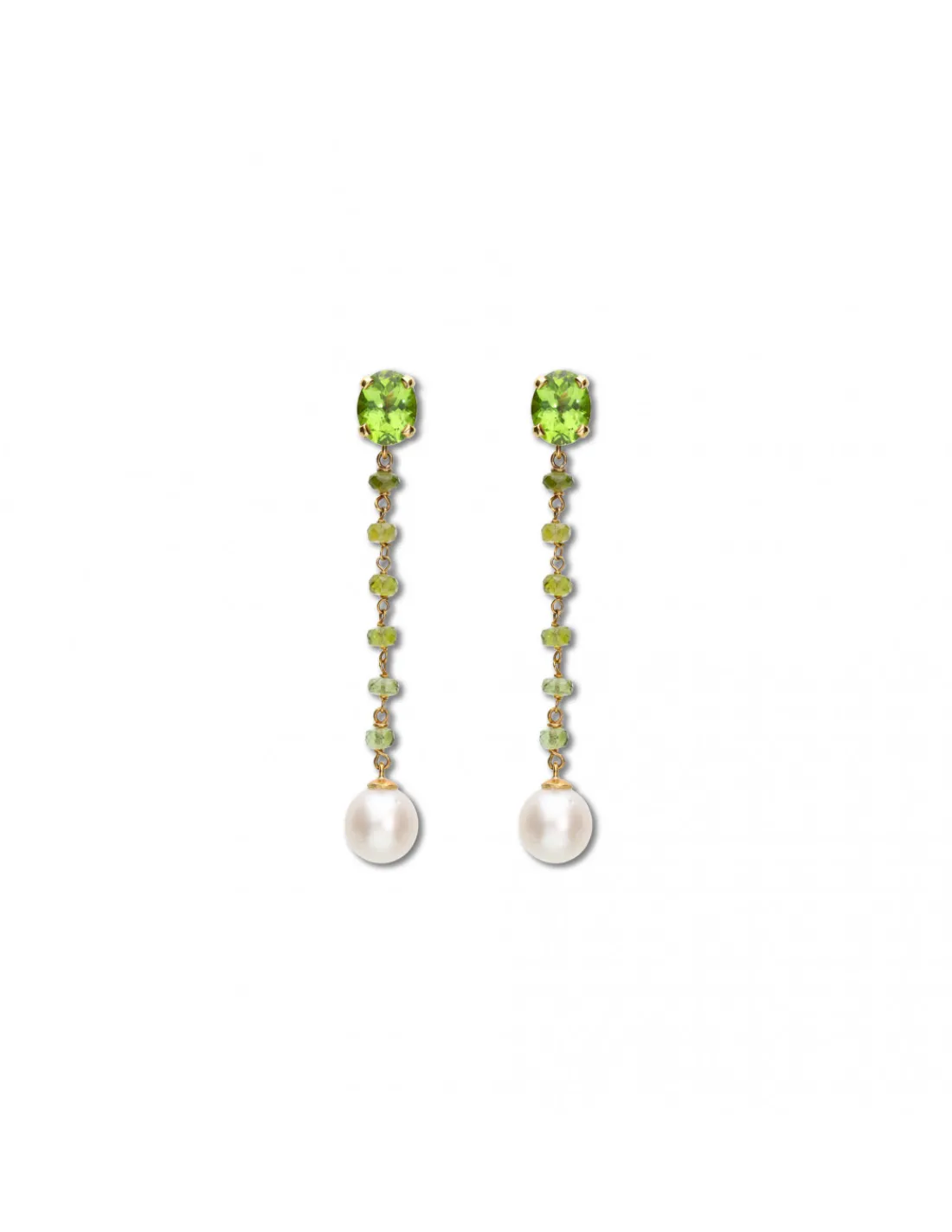 Pendientes de oro amarillo 1ª Ley (750 mmas) con peridoto natural talla oval engastado en garras del que cuelga una cadena con movimiento y varias bolas de pedirotos y perla. Una joya atemporal que aporta color. Cierre de palillo y presión. Largo aproximado 6 cm.