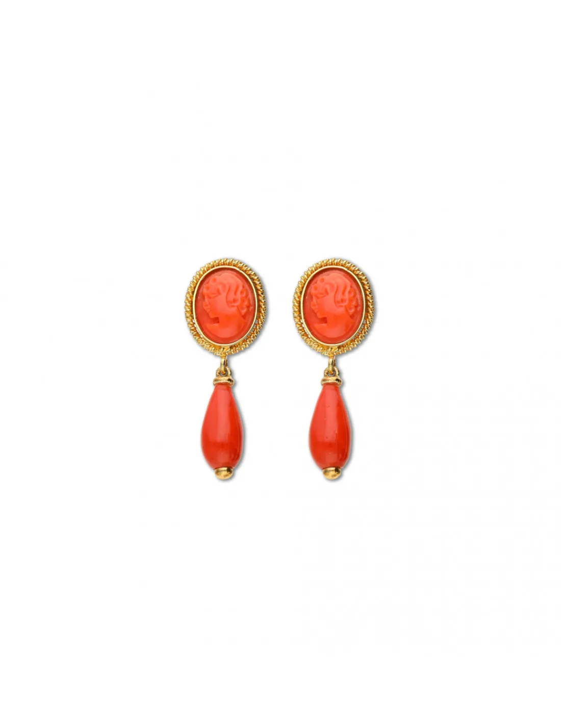 Pendientes de oro amarillo 1ª Ley (750 mmas) con camafeo y lágrima de coral.