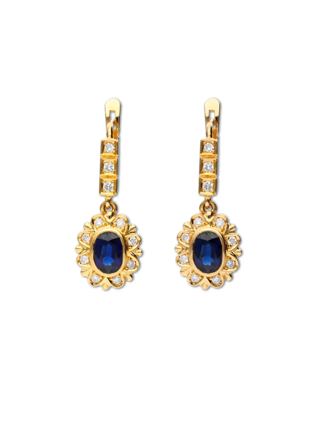 Pendientes de oro amarillo 1ª Ley (750 mmas) con diamantes talla brillante y zafiro talla oval. Un pendiente antiguo, estilo vintage.
