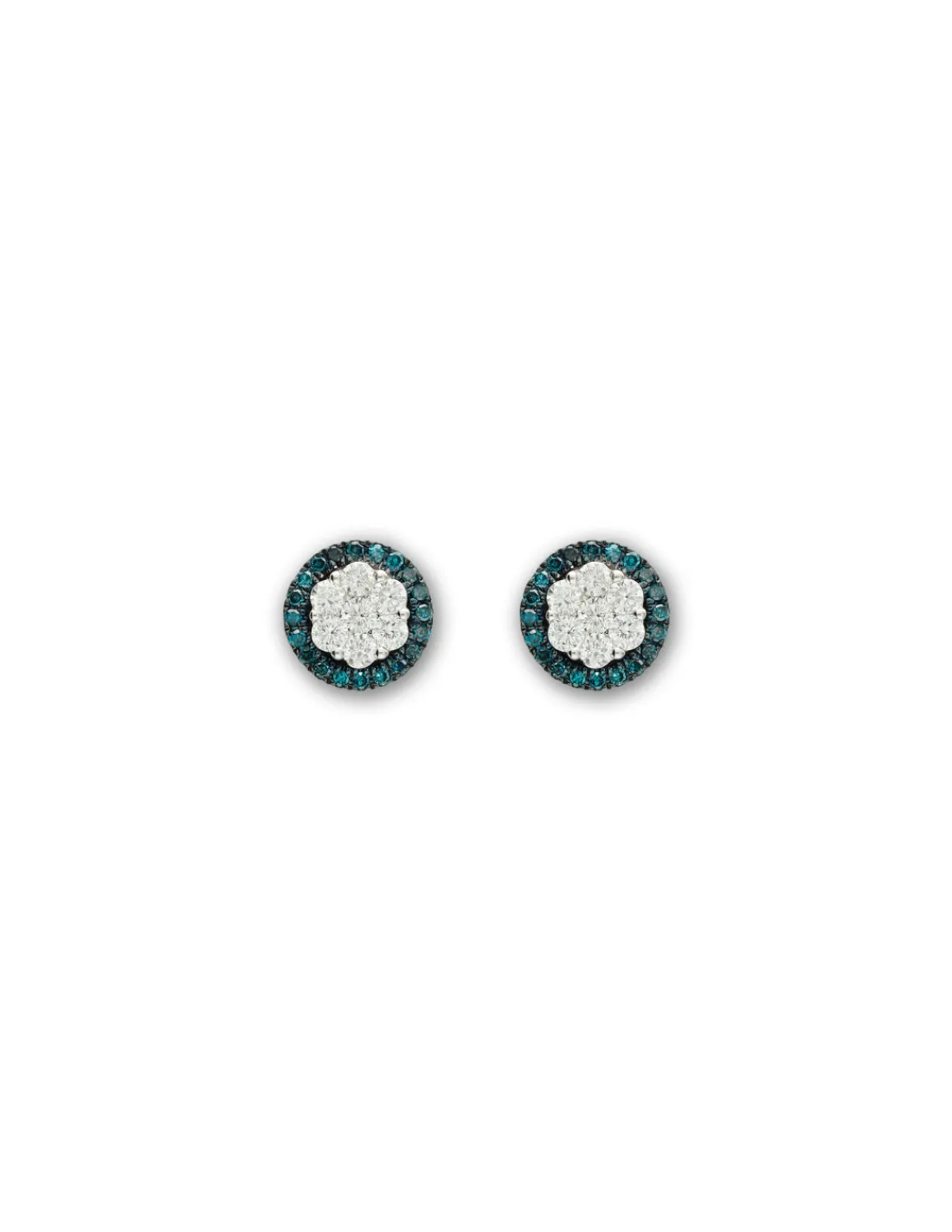 Pendientes de oro blanco 1ª Ley (750 mmas) con diamantes talla brillante en el centro rodeados de una orla de diamantes blue. Una joya fina con color que aporta elegancia y modernidad.