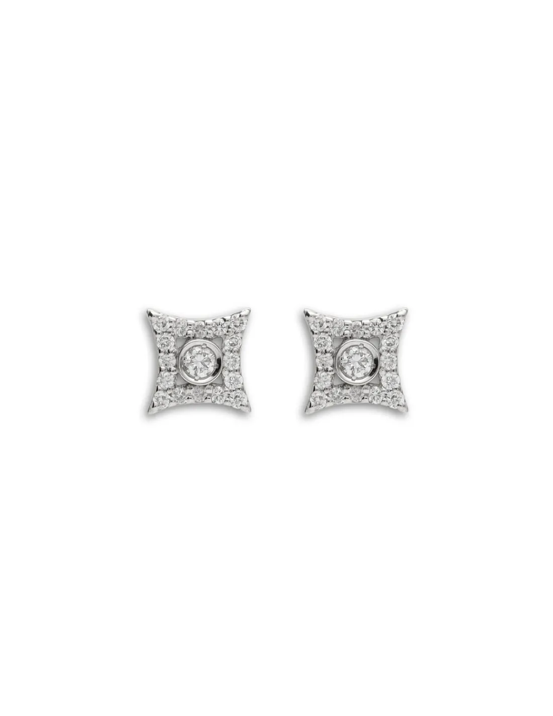 Pendientes de oro blanco 1ª Ley (750 mmas) con un diamante talla brillante engastado en boquilla en el centro rodeado de diamantes más pequeños engastados en grano. Cierre de palillo y presión. Diámetro aproximado 7 mm.