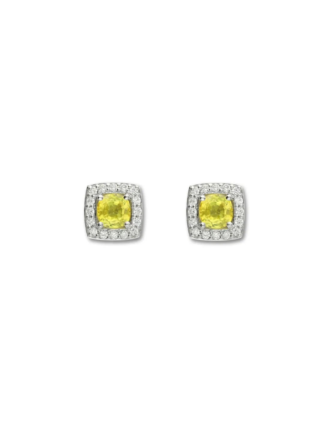 Pendientes de oro blanco 1ª Ley (750 mmas) combinado con un zafiro natural de color talla cushion en el centro engastado en cuatro delicadas garras rodeado de diamantes talla brillante engastados en grano. El diseño cuadrado de esta pieza de color tiene un aspecto moderno y sofisticado. Diámetro aproximado 1 cm. Cierre de palillo y presión.