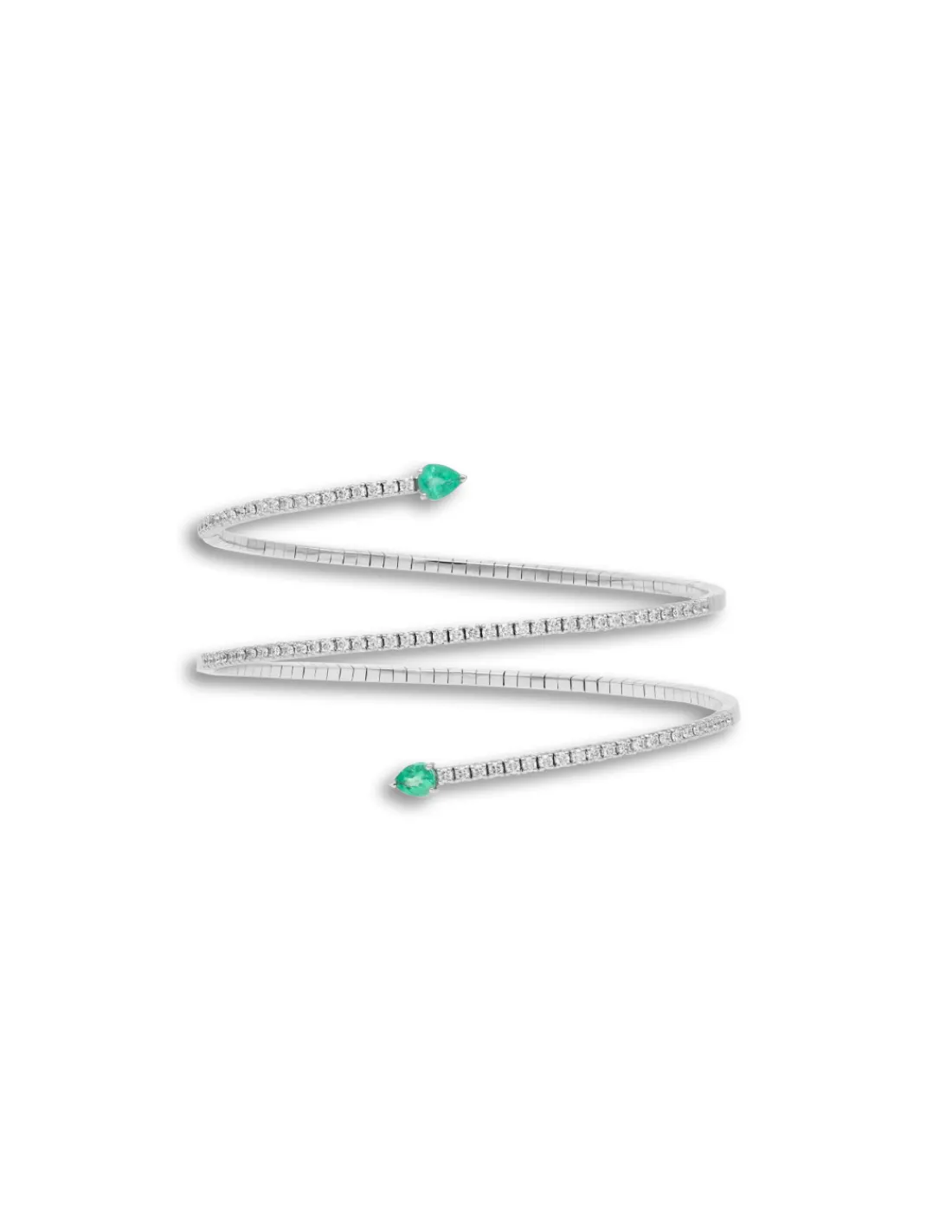 Pulsera de oro blanco 1ª Ley (750 mmas) y titanio con esmeraldas talla pera y diamantes talla brillante. Una elegante pieza de joyería fina con simetrías llenas de armonía.