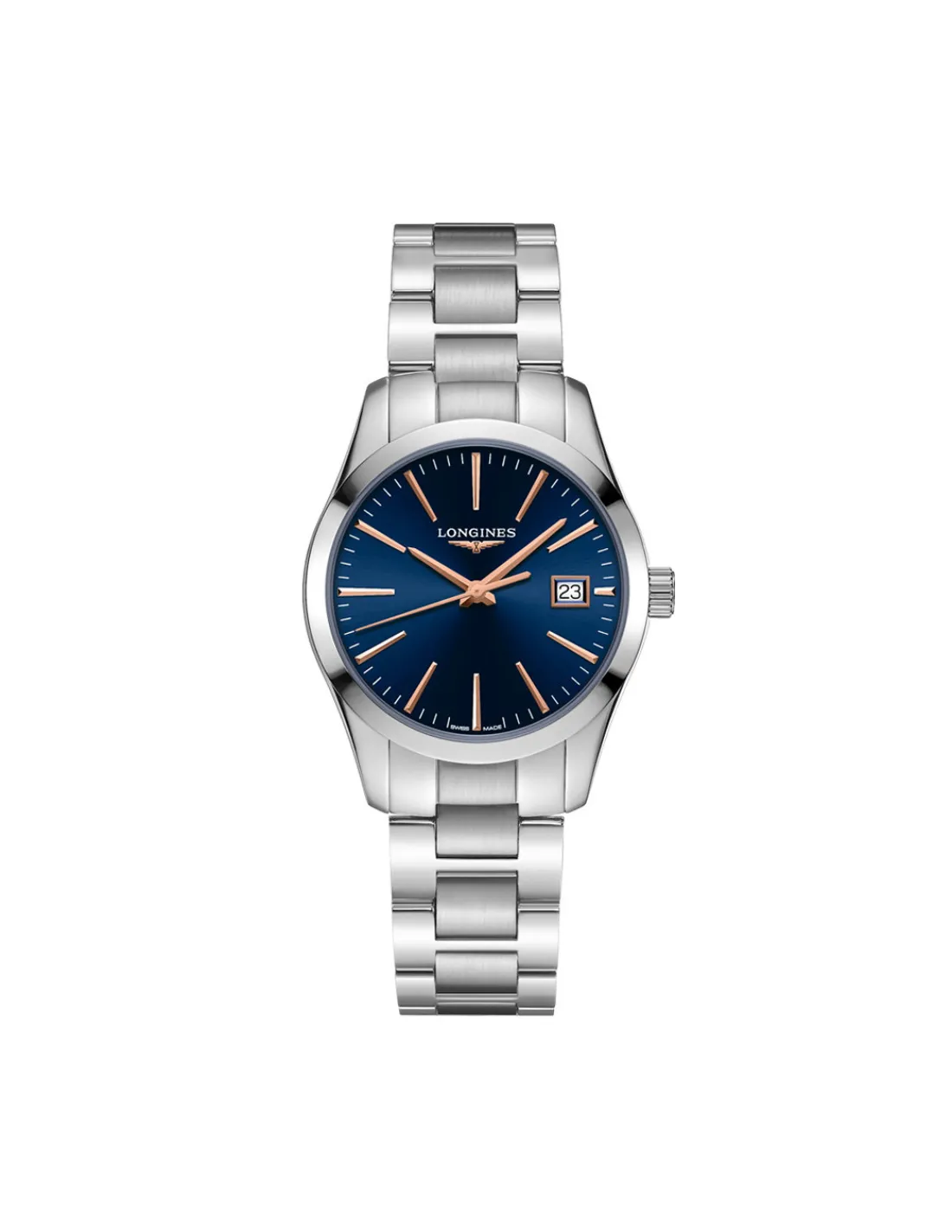 Reloj Longines Conquest Classic para mujer con caja de acero de 34 mm, elegante esfera azul con números romanos y agujas rosa y brazalete de acero. Una pieza elegante y contemporánea. Movimiento de cuarzo Swiss Made.