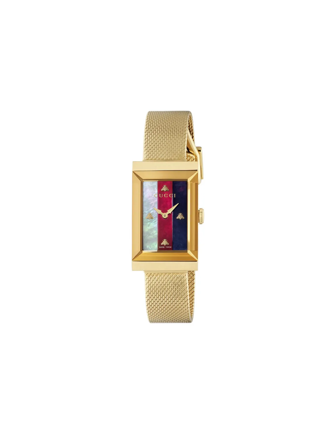 Reloj Gucci G-Frame para mujer con caja rectangular de 21 x 34 mm en pvd oro y esfera tricolor de nácar ( blanca, roja, azul ), todo ello acompañado de un brazalete de malla milanesa dorado que le confiere un aspecto atemporal y sofisticado a la vez. Un reloj de corte clásico con detalles icónicos de la marca. Movimiento de cuarzo Swiss Made.