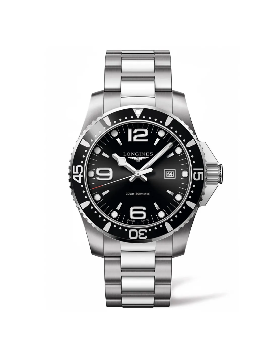 Reloj Longines Hydroconquest para hombre con caja de acero de 44 mm de diámetro, esfera negra con efecto rayos de sol, números romanos y agujas plateadas. Un reloj que reúna excelencia técnica y elegancia. Movimiento de cuarzo Swiss Made.