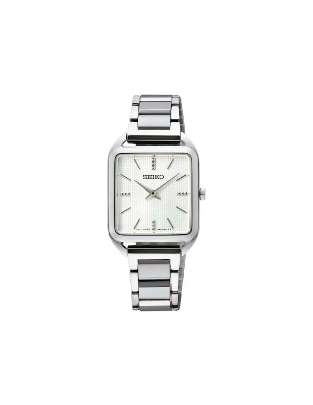 Reloj Seiko para mujer con caja rectangular de acero inoxidable de 26 mm, esfera color blanco y cristal de Hardlex resistente a los arañazos y roturas combinado con brazalete de acero. Movimiento de cuarzo analógico.