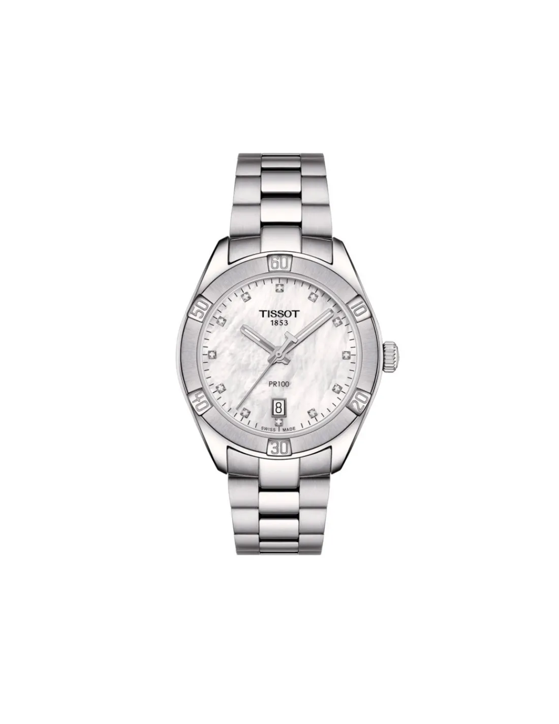 Reloj Tissot PR 100 Sport Chic para mujer con caja de acero de 36 mm de diámetro combinado con esfera de madreperla blanca con índices de diamantes talla brillante de 0,0456 ct VS-SI y brazalete de acero. Un reloj con estética deportiva pero a la vez muy depurada realmente ponible. Movimiento de cuarzo Swiss Made.