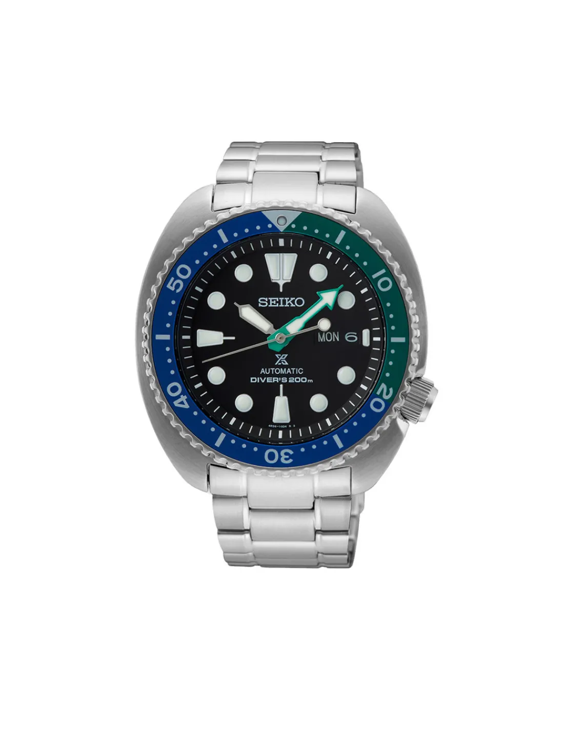 Reloj Seiko Prospex Divers Edición Especial para hombre con caja de acero de 45 mm de diámetro, bisel giratorio unidireccional, esfera negra con Lumibrite en agujas, índices y bisel, cristal de zafiro con revestimiento antirreflectante en la superficie interna y brazalete de acero. Calibre 4R36. Movimiento automático con 41 horas de reserva de marcha aproximadamente.