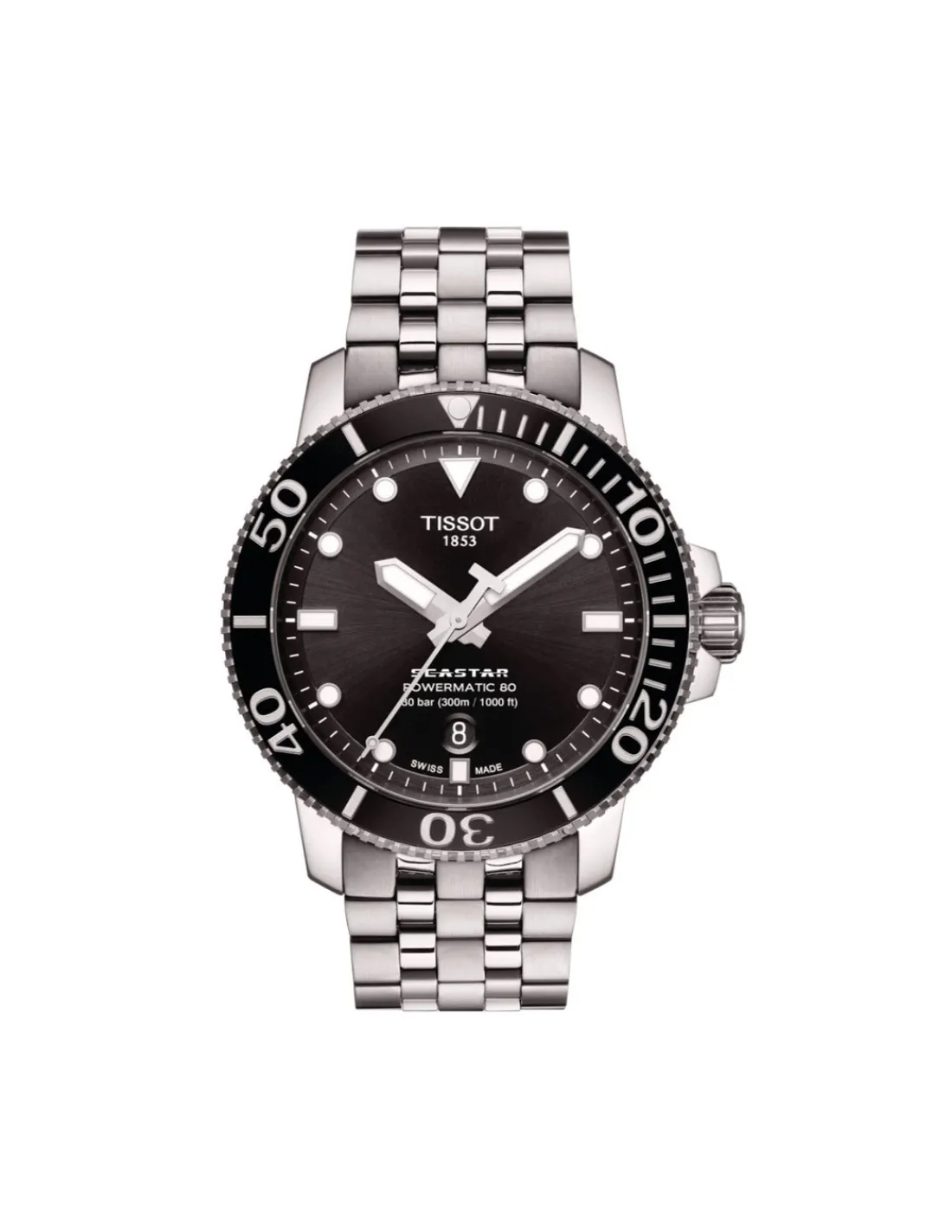 Reloj Tissot Seastar 1000 Powermatic 80 con caja redonda de acero inoxidable de 43 mm de diámetro, anillo bisel cerámico, esfera negra con índices aplicados y agujas Superluminova, cristal de zafiro irrayable con revestimiento antirreflejos combinado con brazalete de acero. Un reloj para deportes acuáticos con movimiento Powermatic 80 Swiss Made que ofrece hasta 80 horas de reserva de marcha.