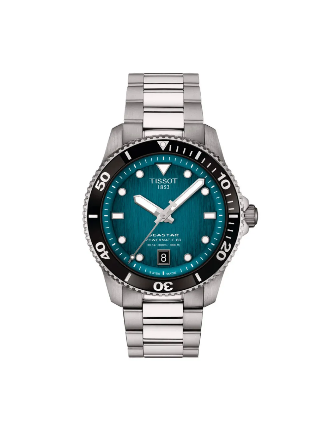 Reloj Tissot Seastar 1000 Powermatic 80 con caja redonda de acero inoxidable de 40 mm de diámetro, esfera degradado turquesa-negro con índices aplicados y agujas Superluminova, cristal de zafiro irrayable con revestimiento antirreflejos combinado con brazalete de acero. Un reloj para deportes acuáticos con movimiento Powermatic 80 Swiss Made que ofrece hasta 80 horas de reserva de marcha.