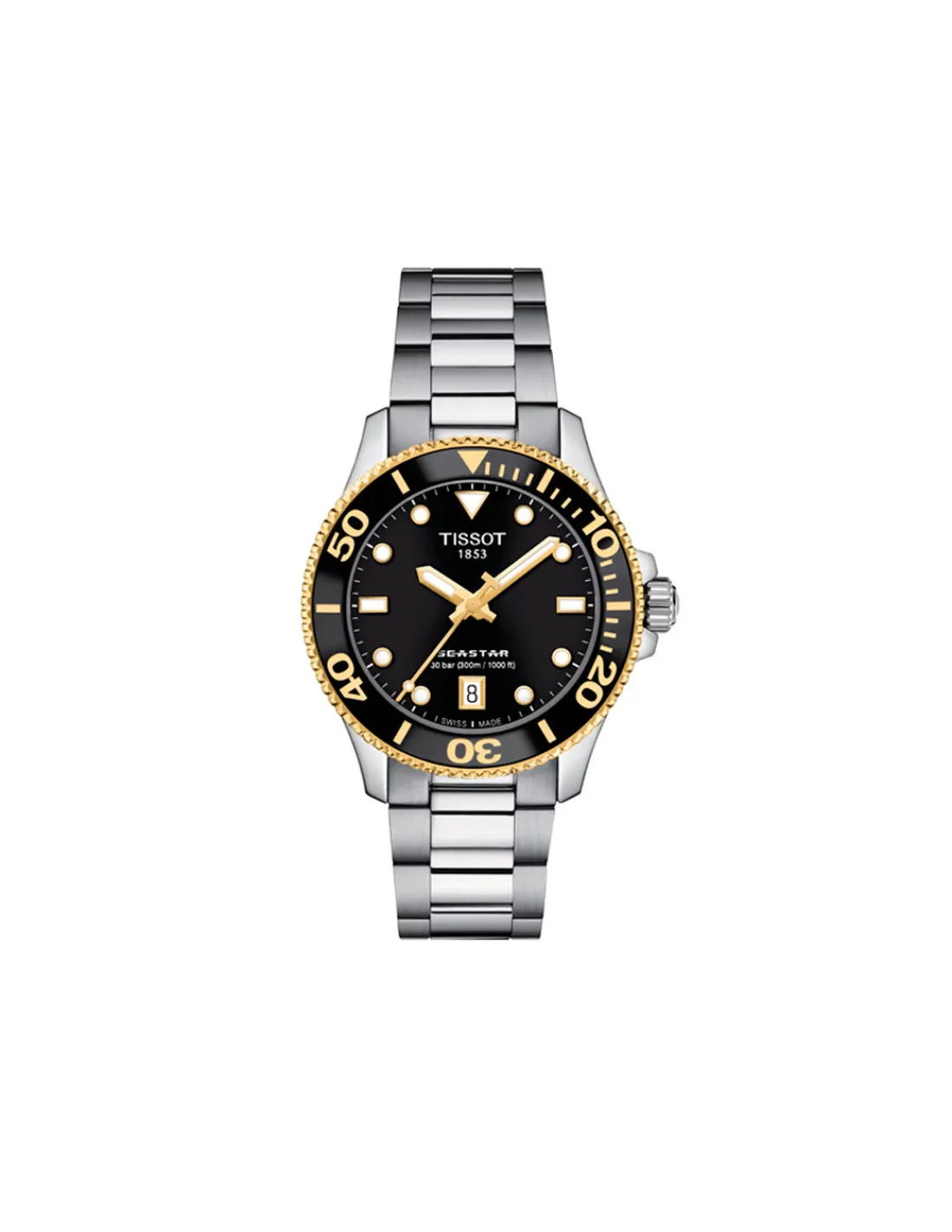 Reloj Tissot Seastar 1000 bicolor unisex con caja de acero inoxidable con revestimiento de PVD de oro amarillo de 36 mm de diámetro, esfera negra con índices aplicados Superluminova, cristal de zafiro resistente a los arañazos combinado con brazalete. Movimiento de cuarzo Swiss Made.