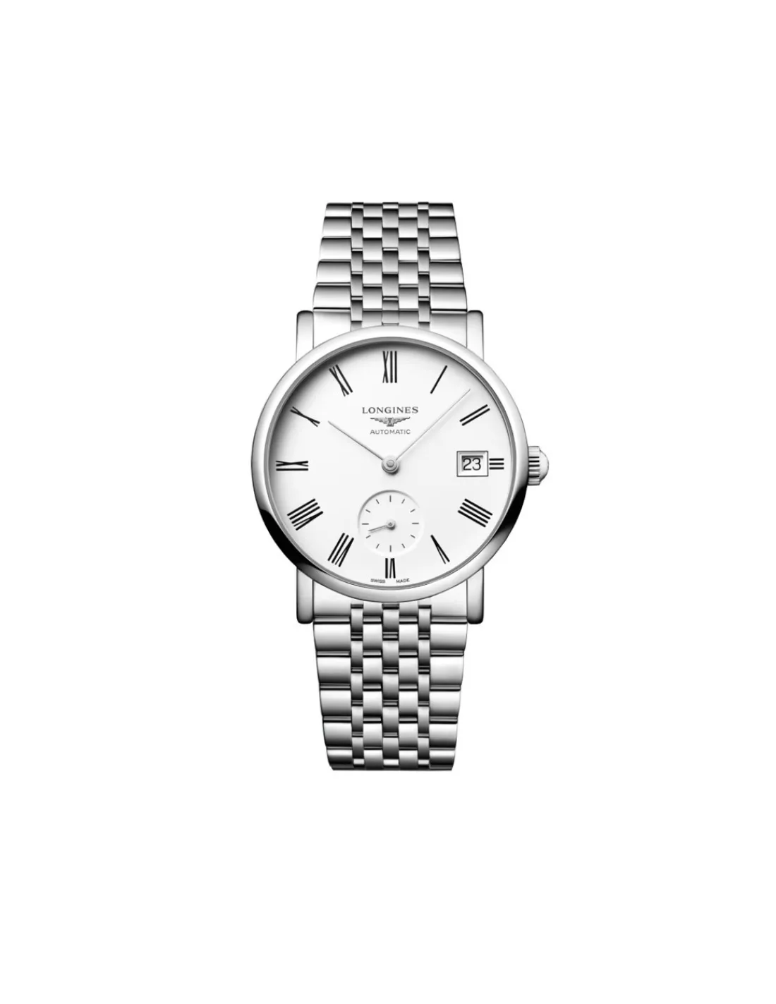 Reloj The Longines Elegant Collection para mujer con caja de acero de 34,50 mm, esfera blanco mate con números romanos pintados, agujas plateadas pulidas y brazalete. El reloj representa a la perfección el clasicismo y la sobriedad característicos de Longines. Movimiento automático Swiss Made con 72 horas de reserva de marcha aproximadamente.