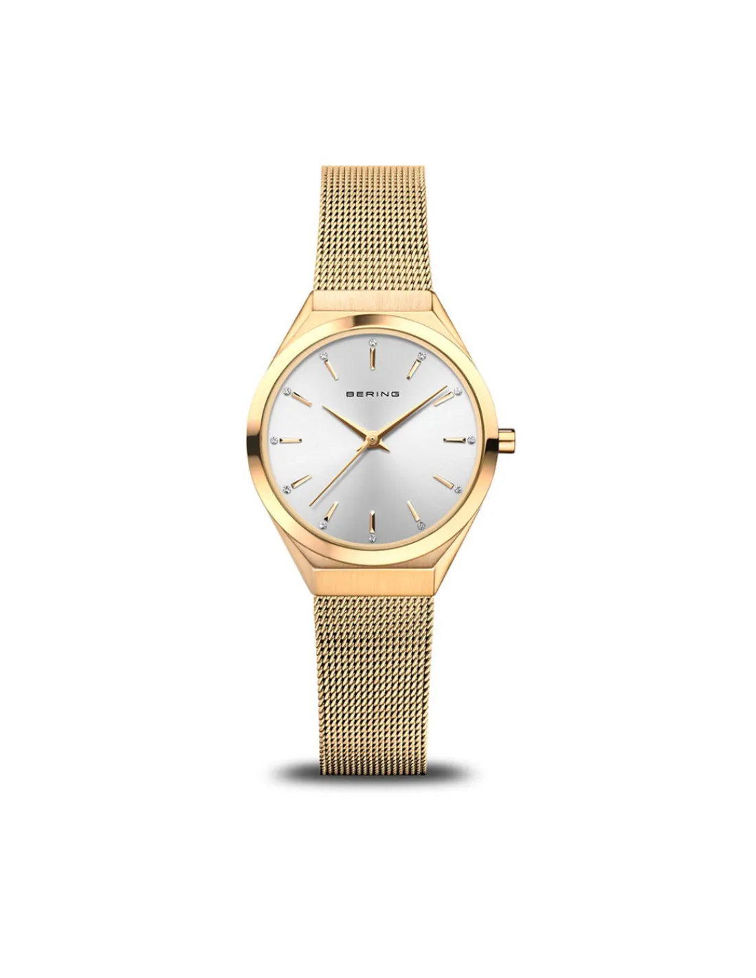 Reloj Bering Ultra Slim 18729-330 para mujer con caja de acero, esfera plata y pulsera de malla milanesa color oro. Movimiento de cuarzo.