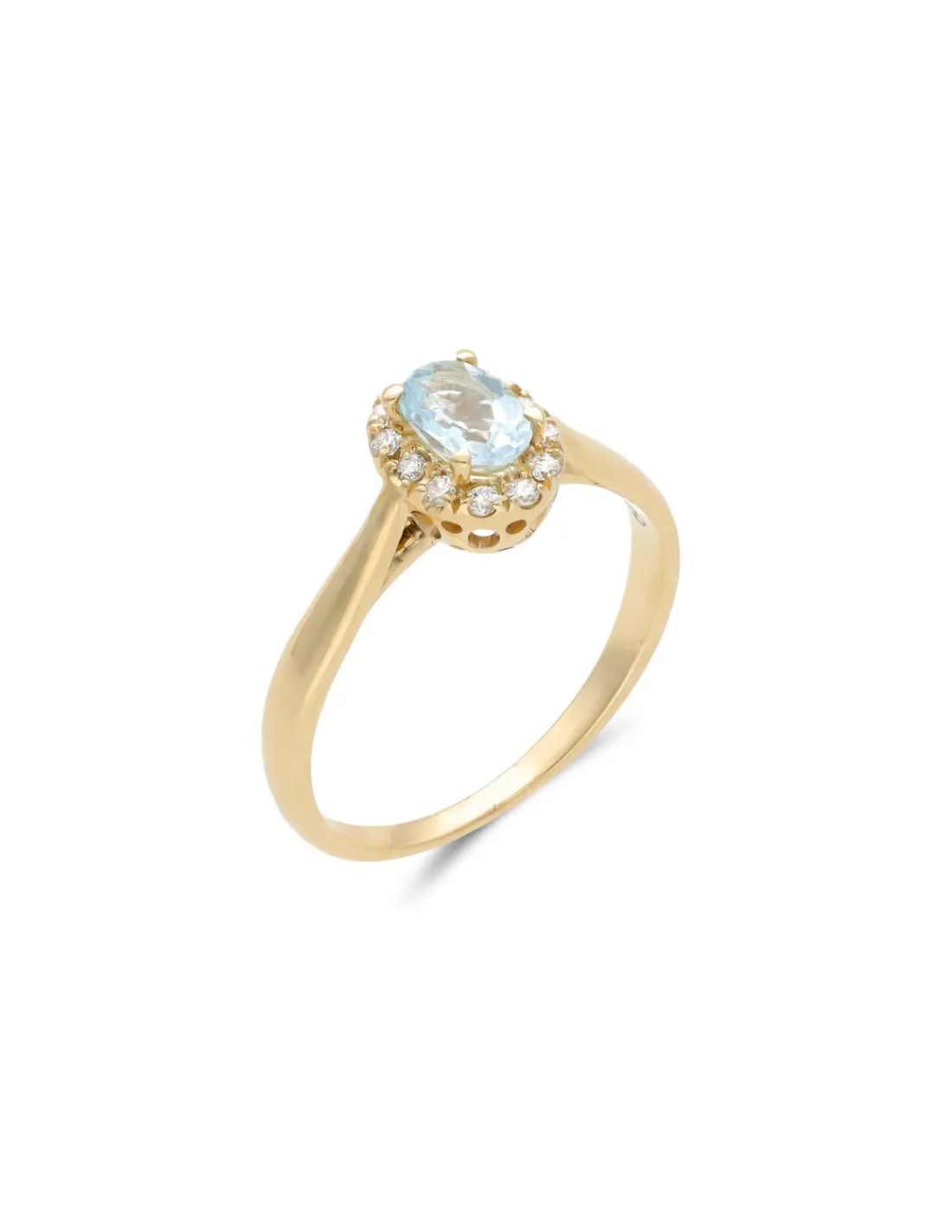 Anillo de oro amarillo 9 kt (375 mmas) con aguamarina oval en el centro rodeada de una orla de diamantes talla brillante. Talla 13.