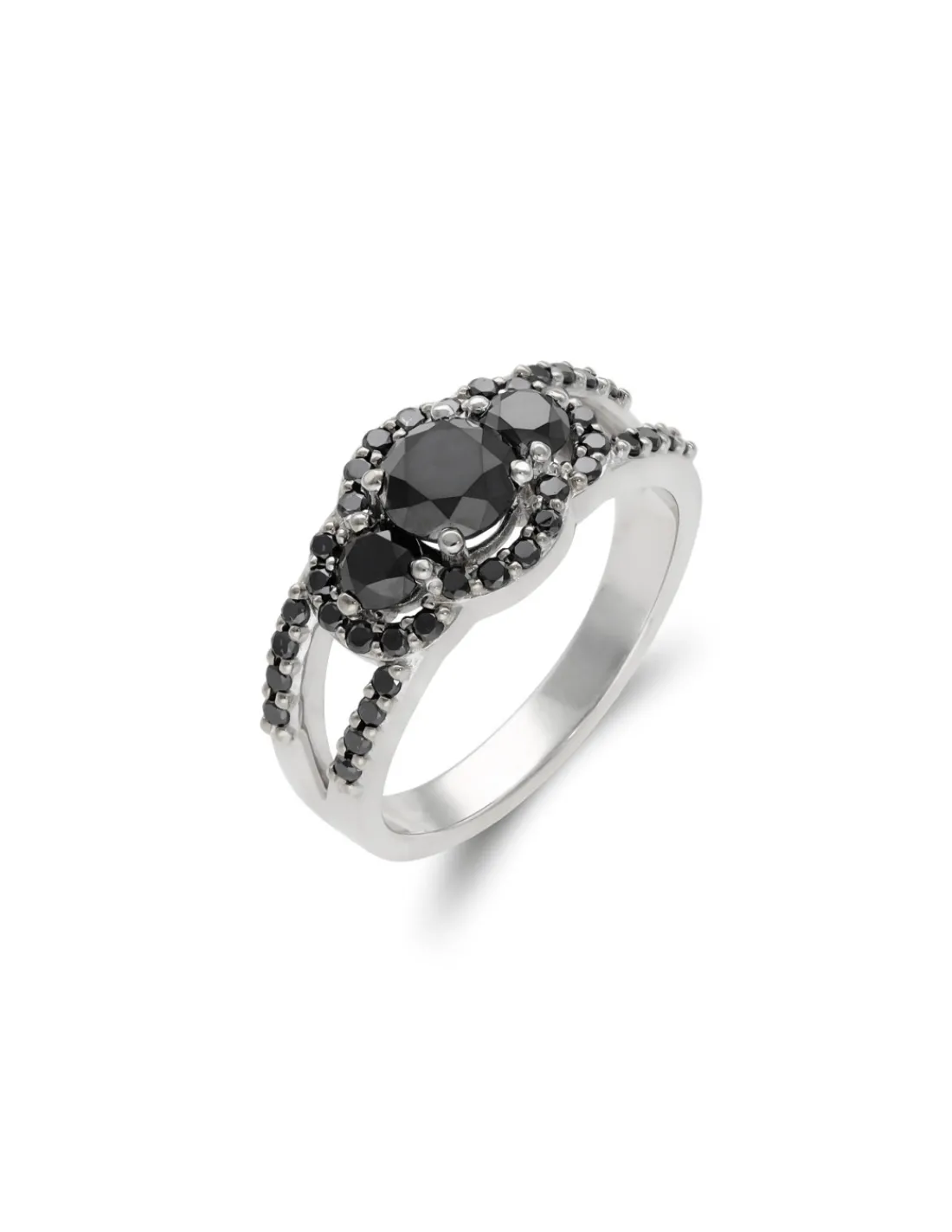 Anillo de oro blanco 1ª Ley (750 mmas) con diamantes negros. La fusión del oro blanco con los diamantes negros crea una profundidad y un brillo que resultan a la vez clásicos y contemporáneos.