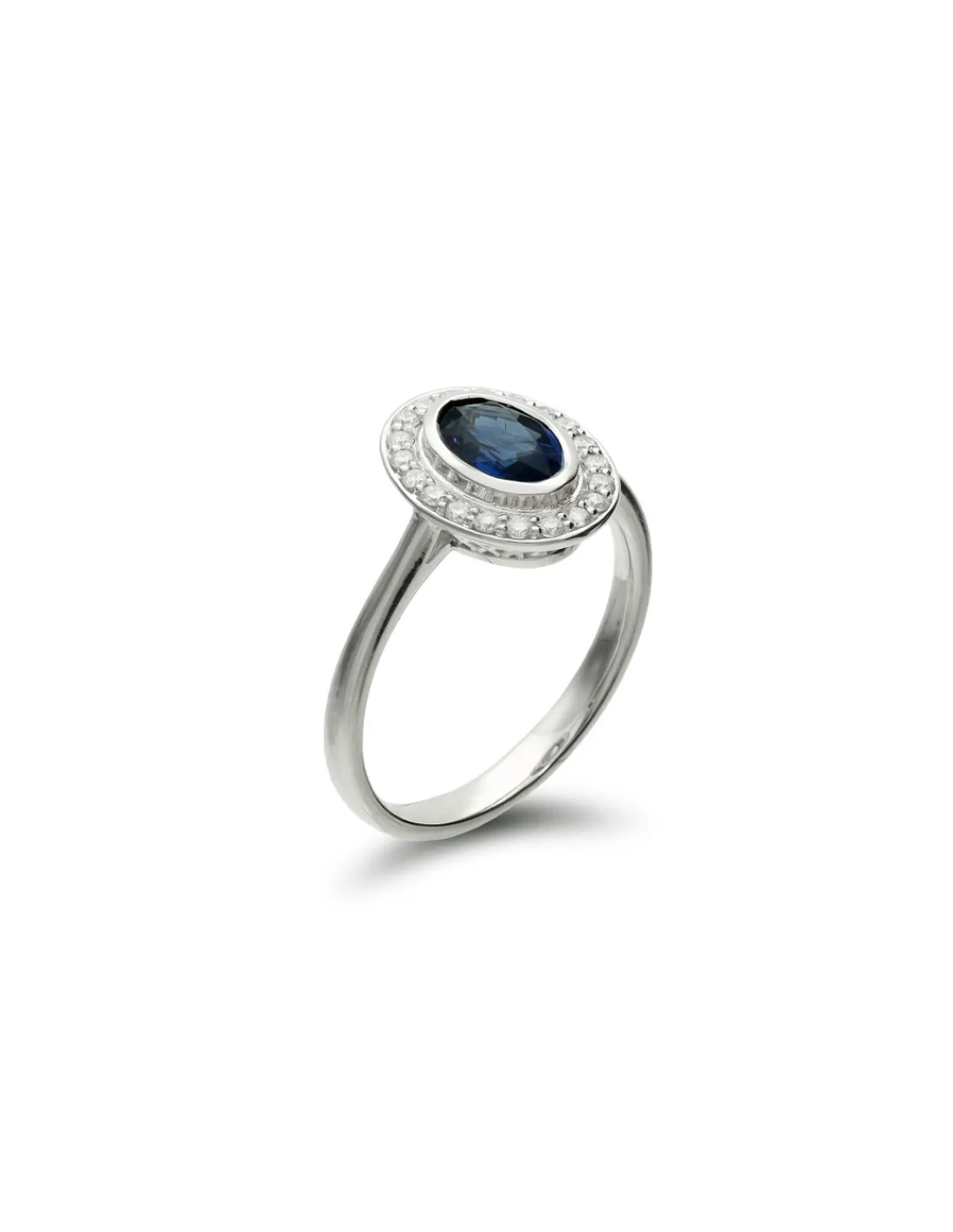 Anillo de oro blanco 1ª Ley (750 mmas) con zafiro oval en el centro rodeado por una orla de diamantes. Talla 13.