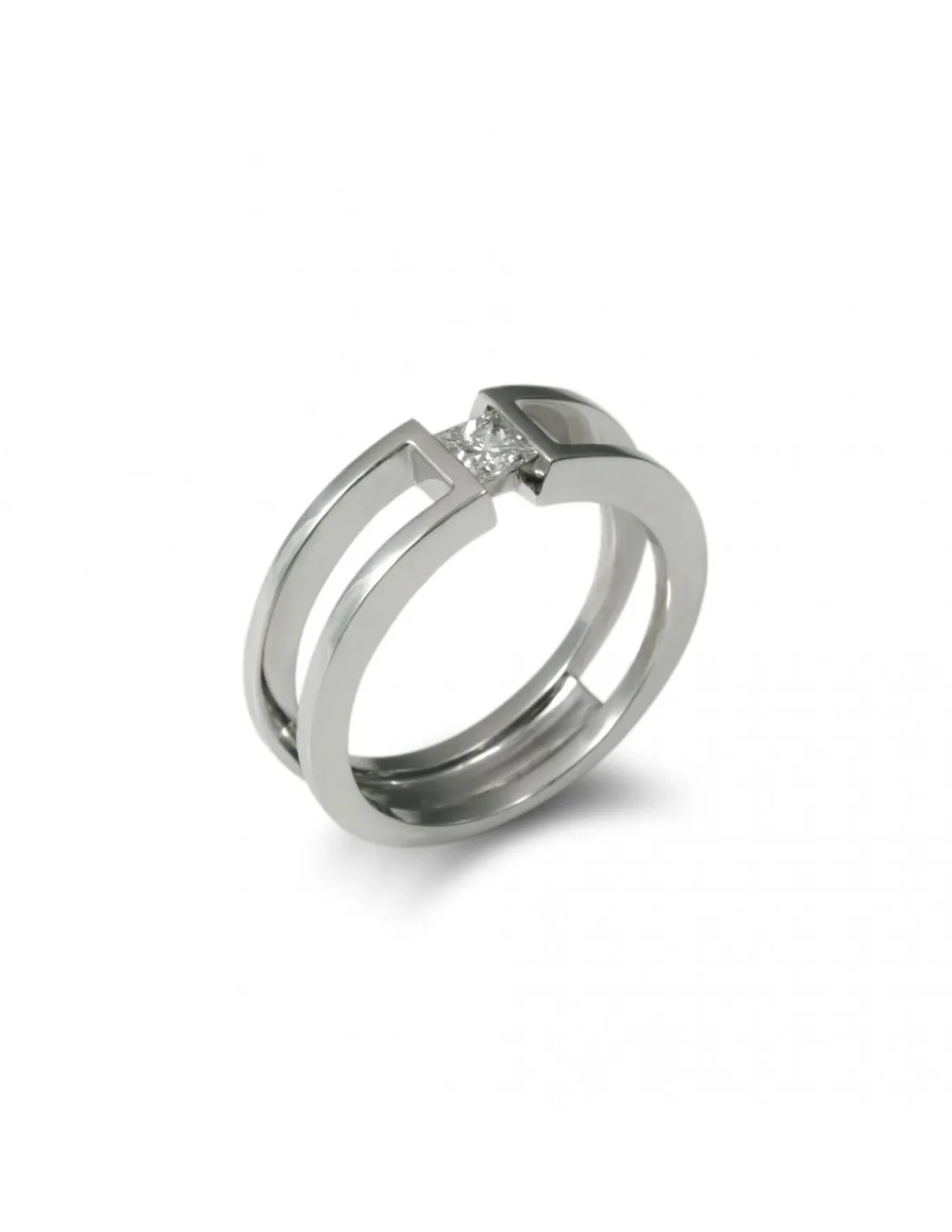 Anillo-Solitario de oro blanco 1ª Ley (750 mmas) con doble aro cuadrado y un diamante talla princesa en el centro. Talla 14.