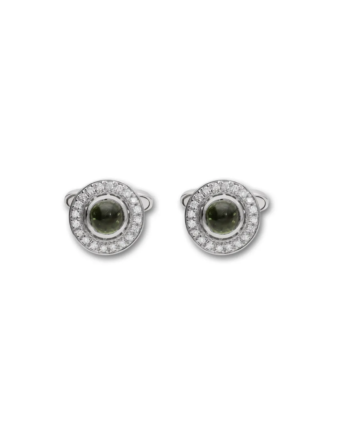 Gemelos de oro blanco 1ª Ley (750 mmas) con turmalina cabujón rodeada de una orla de diamantes.